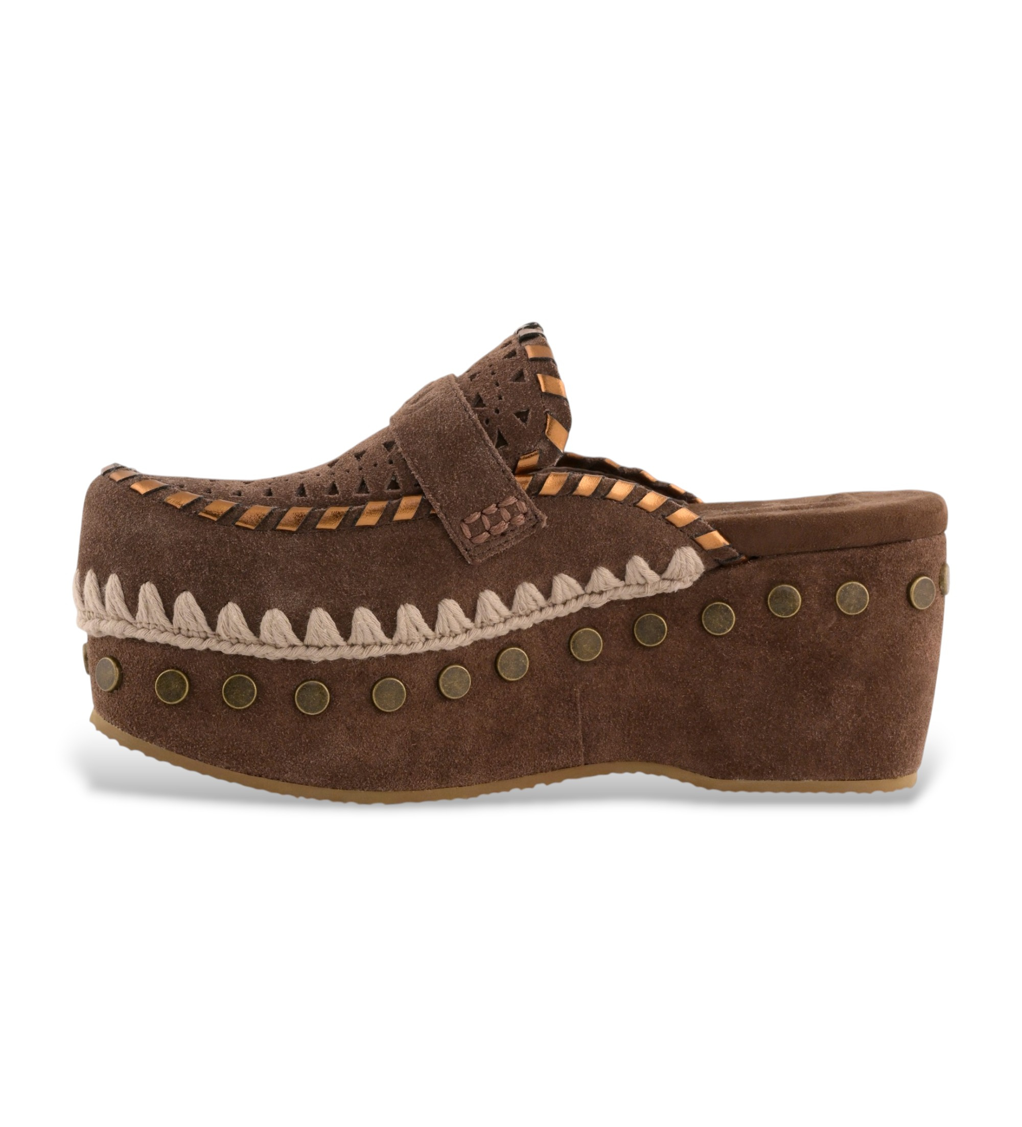 El zueco de verano mou se ofrece con costuras en contraste para añadir un toque de color. Disponible en tres preciosos tonos con las características costuras de ganchillo de la marca. El soporte ligero para el talón está decorado con tachuelas de metal y cuenta con una plantilla acolchada para mayor comodidad. Altura del zueco 6,7 cm.