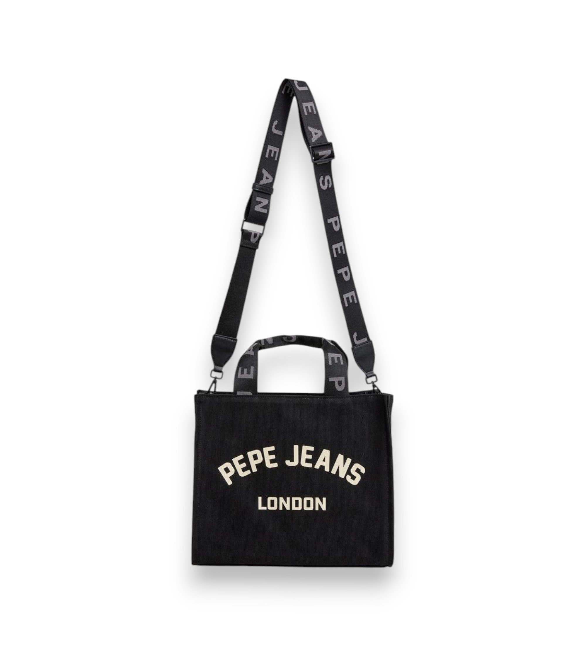 El bolso Trisha de Pepe Jeans es una elección elegante para cualquier ocasión casual. Fabricado en resistente lona de algodón, este bolso presenta un diseño en color negro con un logotipo llamativo de la marca en la parte frontal. Cuenta con doble asa para mayor comodidad, así como una correa ajustable y desmontable para llevar al hombro. El interior incluye un práctico bolsillo para mantener tus pertenencias organizadas. Un toque de distinción lo aporta el parche en PU con el logo clásico grabado en relieve. Ideal para la mujer moderna que busca funcionalidad sin renunciar al estilo.