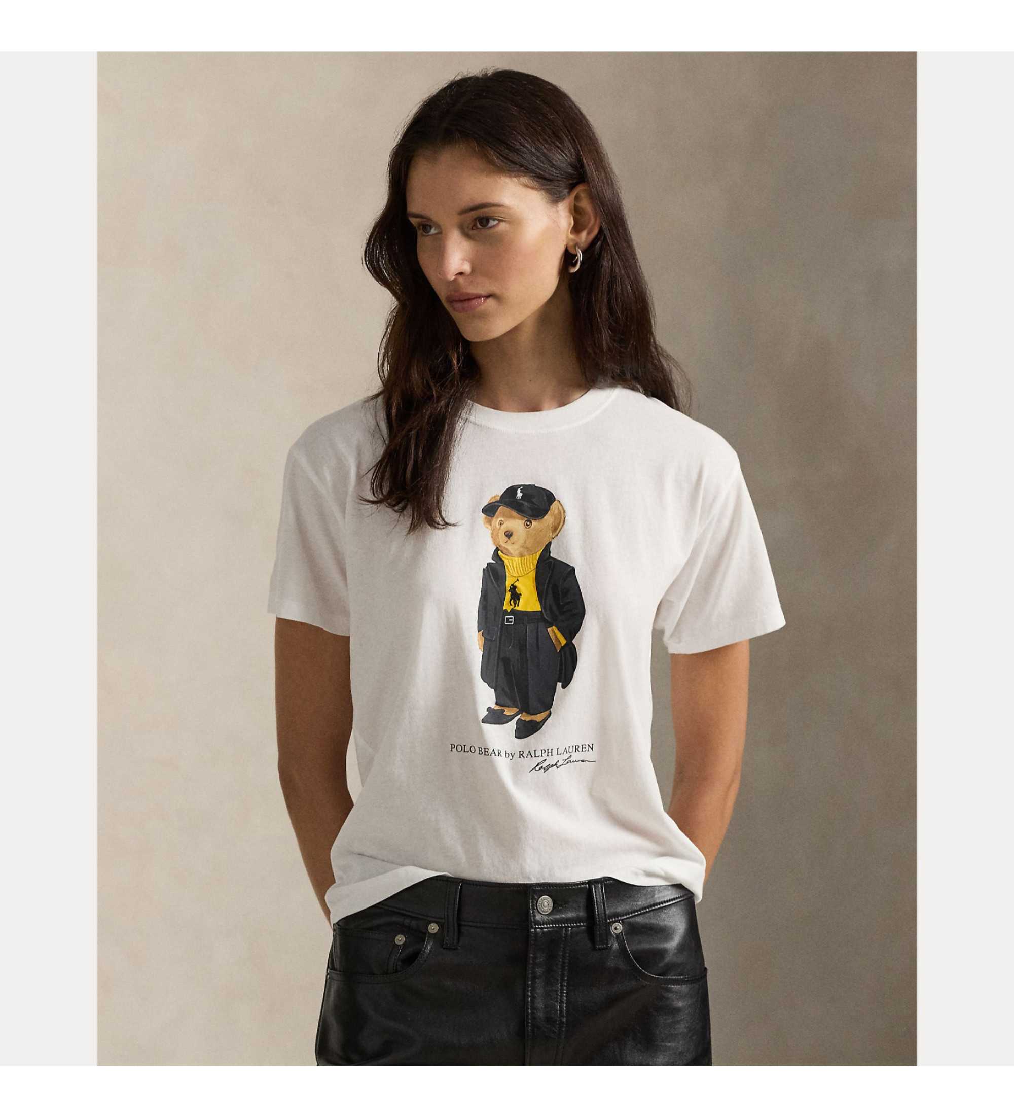 Esta camiseta de cuello redondo está confeccionada en jersey de algodón y tiene un estampado de goma del oso Polo con un look de Ralph Lauren, completo con una gorra de béisbol Pony característica.