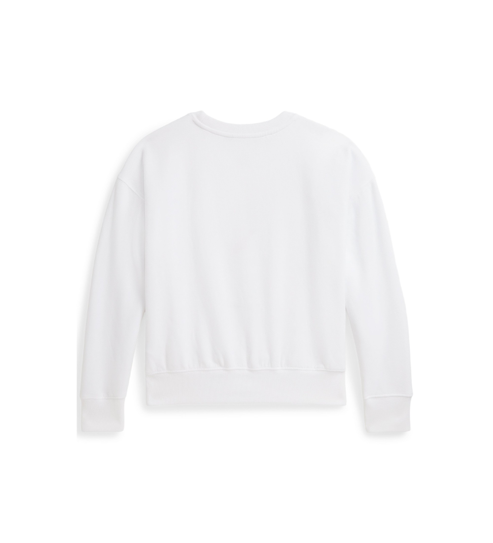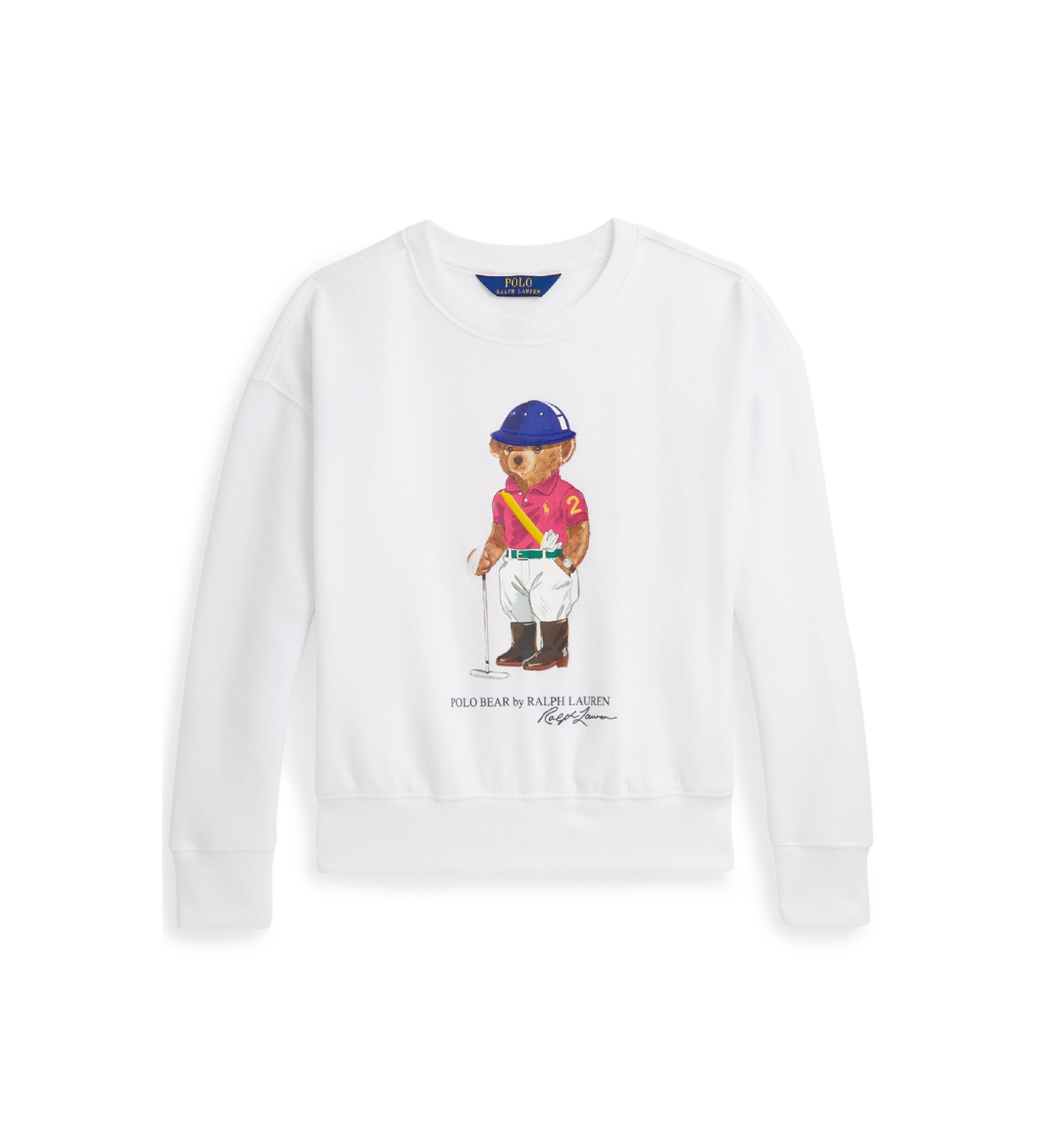 60 % algodón, 40 % poliéster. Lavable a máquina. Corte cuadrado. La talla M tiene un largo de cuerpo de 49,5 cm (delantero y trasero) y un largo de manga de 67,5 cm. El largo de manga se mide desde el centro de la nuca. Cuello redondo. Mangas largas con hombros caídos y puños acanalados. Polo Bear, "Polo Bear by Ralph Lauren" y "Ralph Lauren" estampados en el centro delantero. Detalles bordados. Bajo acanalado. Importado.