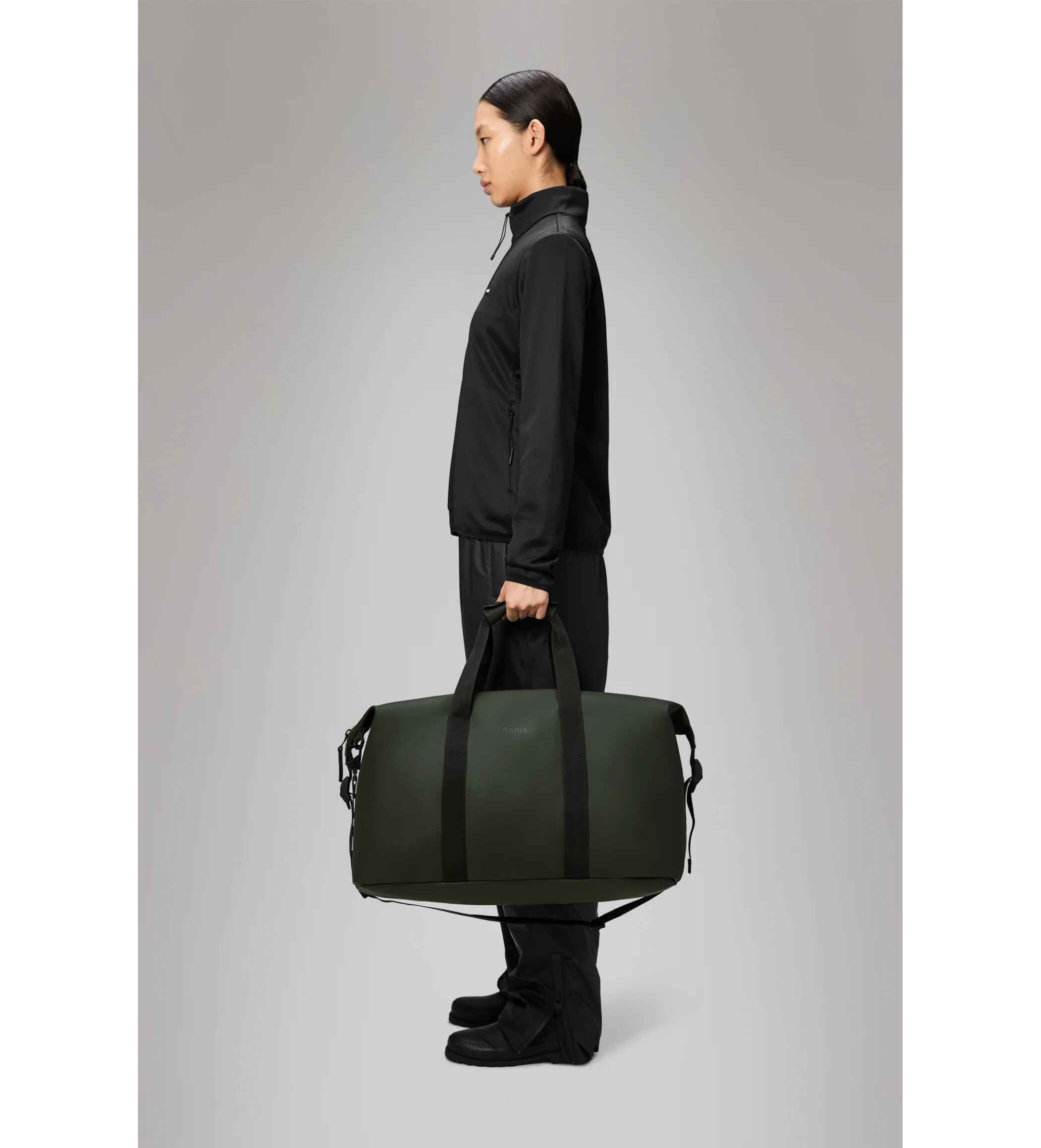 Hilo Weekend Bag está confeccionada en el tejido de PU impermeable característico de Rains, creado para ofrecer robustez en el transporte, durabilidad y un suave acabado.