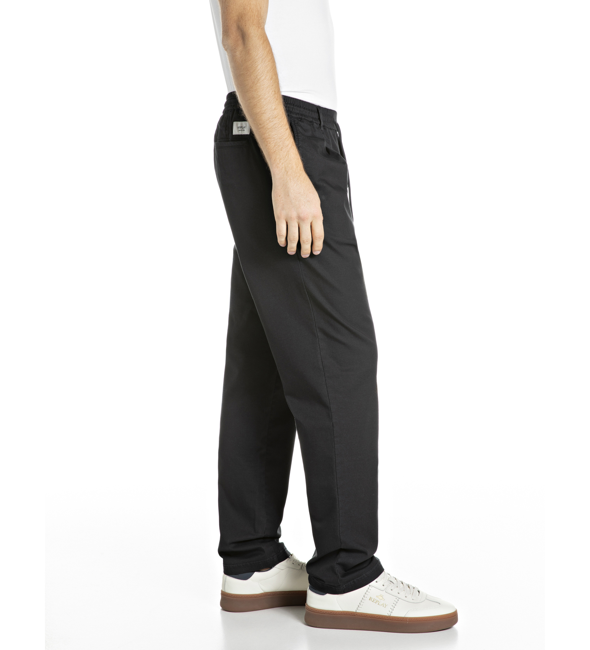 Pantalón de corte relajado con pinzas delanteras y tejido chino de gran calidad, donde la comodidad no renuncia a la elegancia. La cintura elástica con cordón ajustable de puntas metálicas eleva este pantalón por encima del universo sportwear, convirtiéndolo en una pieza híbrida perfecta para el hombre contemporáneo que exige versatilidad sin sacrificar el estilo. La firma Replay en su máxima expresión de sofisticación casual.