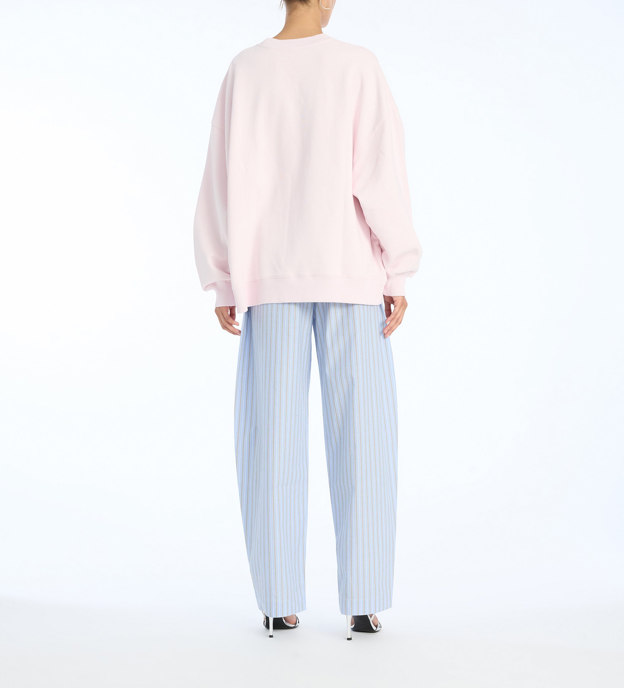 Sudadera en rosa claro, confeccionada en algodón orgánico con un estilo relajado y cómodo. Presenta cuello redondo, hombros caídos y mangas largas con puños de canalé. El logotipo tonal de ROTATE está bordado en el pecho y el bajo se remata con un amplio ribete de canalé.