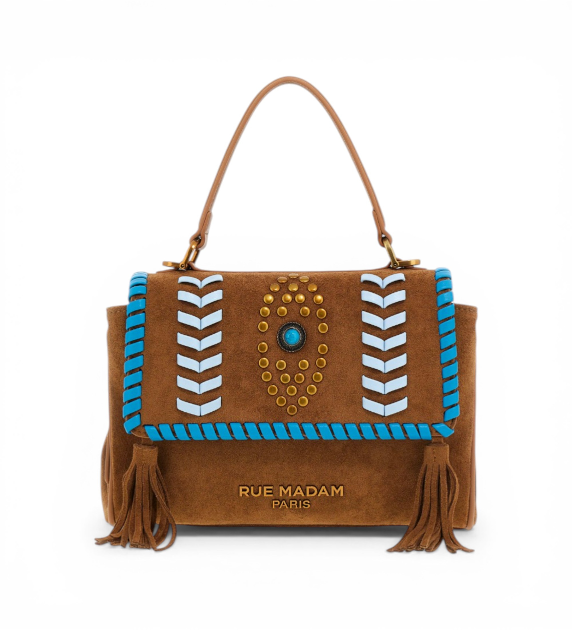 Bolso pequeño de hombro en suave ante sintético, con un diseño atemporal y sofisticado, adornado con pespuntes decorativos y tachuelas de estilo étnico que realzan su carácter. El logotipo metálico dorado y las borlas de ante le aportan un toque refinado y distintivo. Equipado con asa y correa de hombro extraíble para mayor versatilidad, incluye un compartimento central y un interior forrado en algodón con bolsillo para una práctica organización de los objetos personales. Dimensiones: 26 cm de ancho × 19 cm de alto × 10 cm de profundidad.