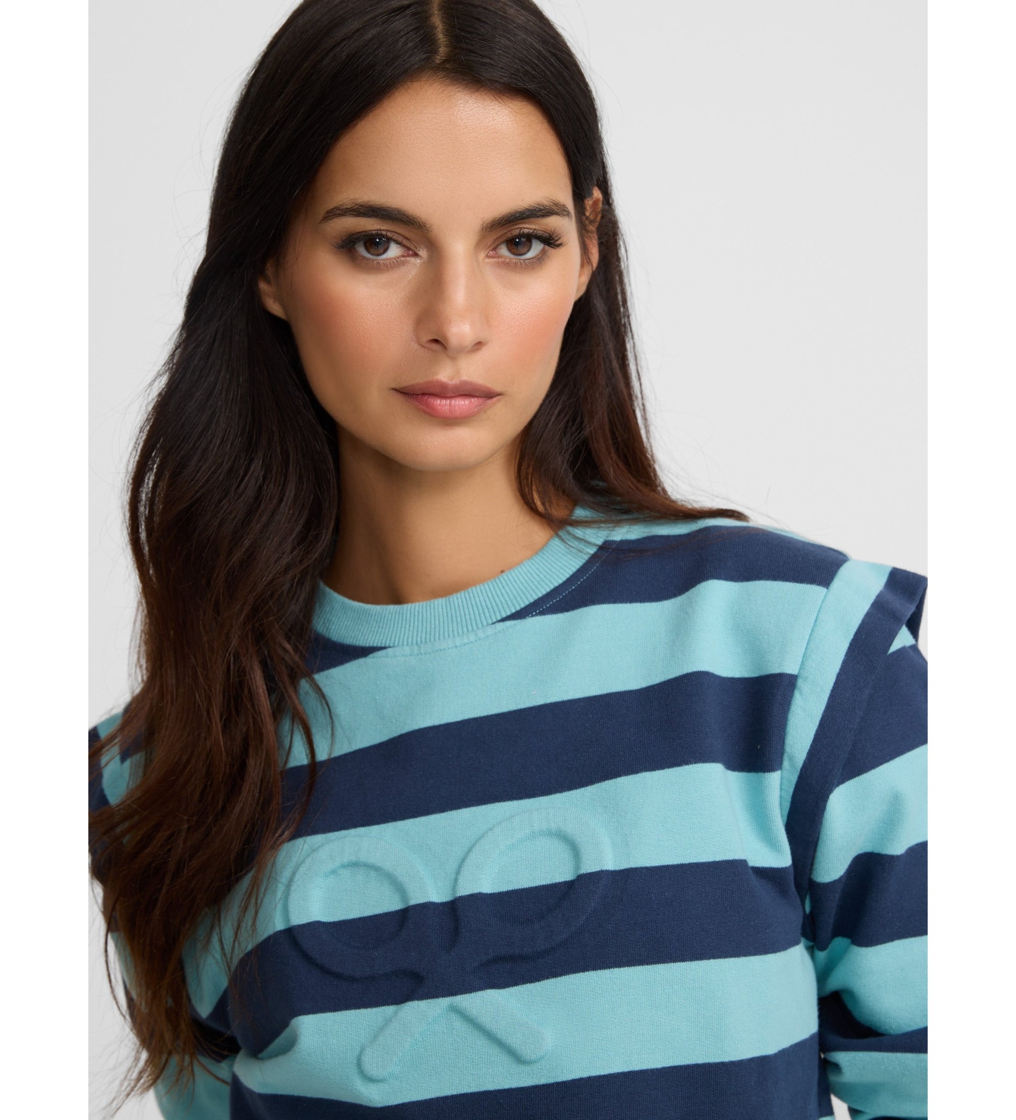 Sudadera de rayas en tonos azules confeccionada en 100% algodón con corte regular fit. Presenta detalle de raquetas Silbon en relieve en el torso. Cuenta con cuello redondo y manga larga con puño elástico con detalle de efecto hombrera. Fabricada en Portugal.