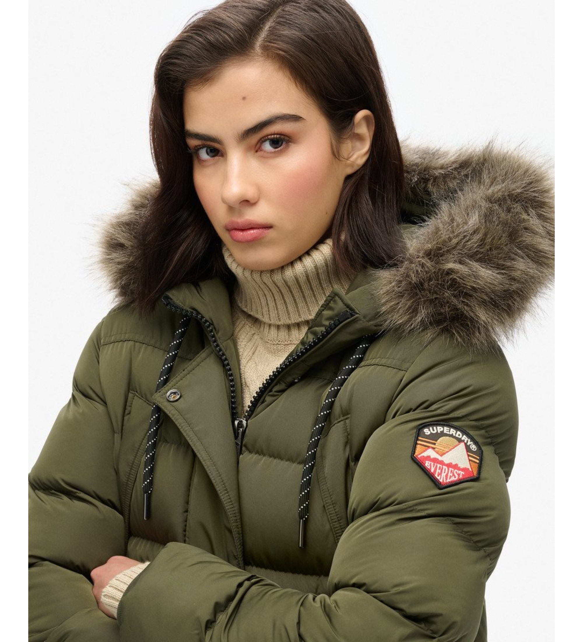 Abrigo acolchado largo de inspiración urbana, ideal para los días más fríos. Su diseño en color verde caqui se complementa con una capucha con ribete de pelo sintético desmontable, que aporta un toque versátil y sofisticado. El acolchado de volumen medio-grueso garantiza calidez y comodidad, mientras que los bolsillos con cremallera añaden practicidad al look. El detalle del parche bordado en la manga refuerza el carácter distintivo de la prenda.