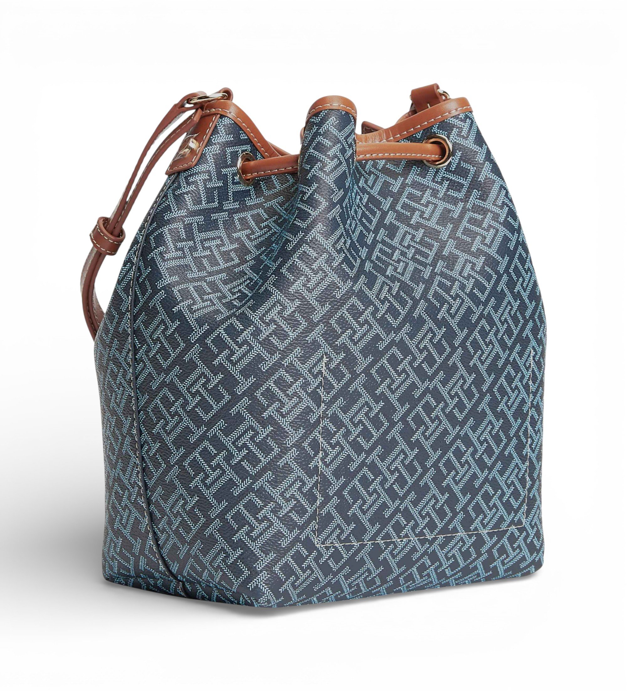 Bolsa de cubo de diseño elegante y contemporáneo, perfecta para aportar un toque distintivo a cualquier look diario. Su formato tipo saco con cierre ajustable mediante cordón combina funcionalidad y estilo, permitiendo un acceso cómodo al interior. Presenta un diseño estampado integral realzado por una franja central característica y detalles cuidados que aportan personalidad y sofisticación. Incorpora asa larga regulable para llevar al hombro o cruzada, adaptándose a diferentes estilos y momentos del día. Un accesorio versátil que combina practicidad y estética icónica.