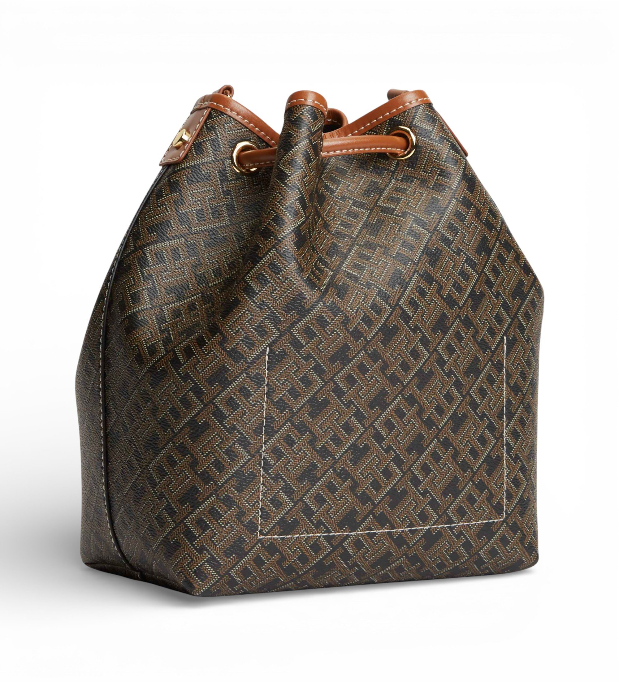 Bolsa de cubo de diseño elegante y contemporáneo, perfecta para aportar un toque distintivo a cualquier look diario. Su formato tipo saco con cierre ajustable mediante cordón combina funcionalidad y estilo, permitiendo un acceso cómodo al interior. Presenta un diseño estampado integral realzado por una franja central característica y detalles cuidados que aportan personalidad y sofisticación. Incorpora asa larga regulable para llevar al hombro o cruzada, adaptándose a diferentes estilos y momentos del día. Un accesorio versátil que combina practicidad y estética icónica.