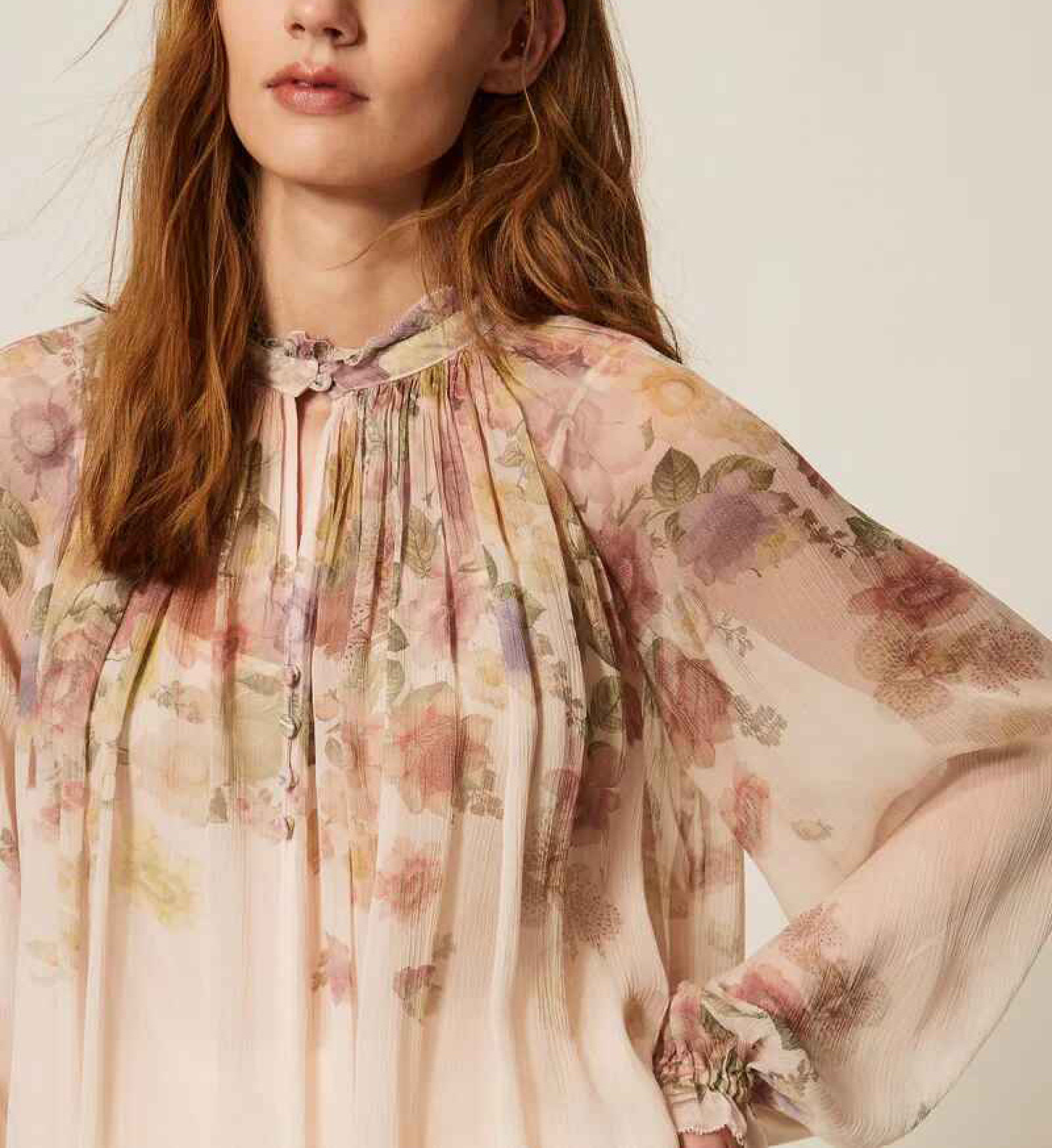 Blusa de crepé de viscosa con estampado posicionado de flores en degradado, un diseño exclusivo de Twinset. Presenta un cuello redondo, cierre de lágrima con botones, manga larga con elástico en el bajo y volantes, top con tirantes finos a juego y corte amplio.