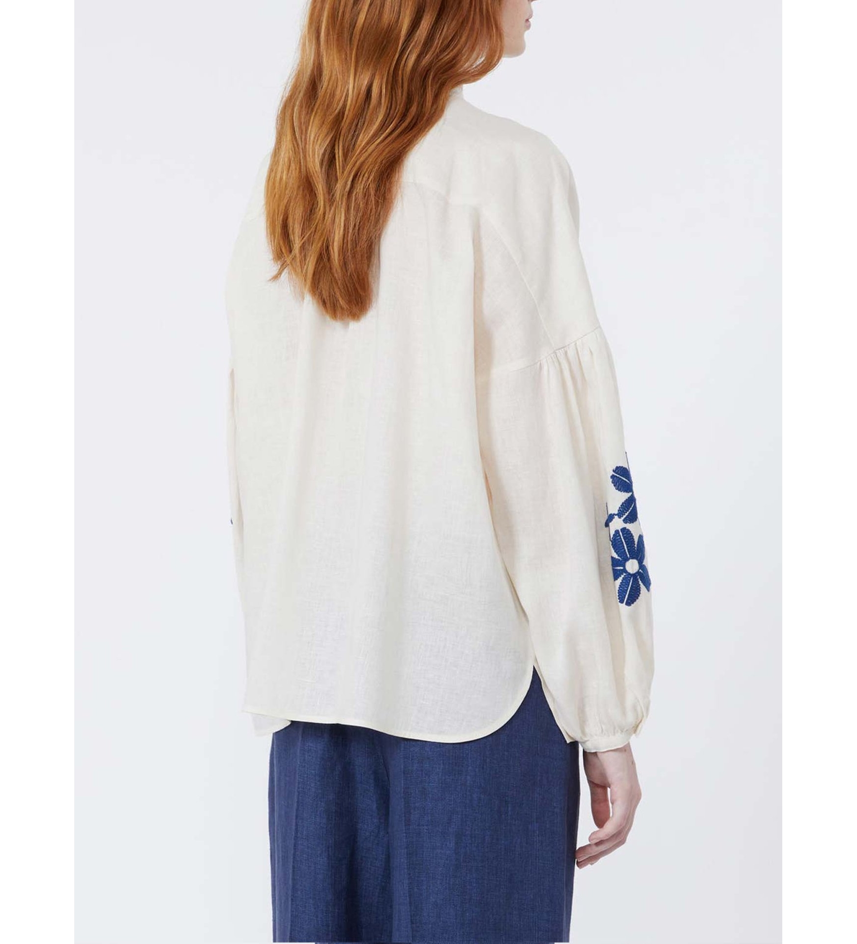 Camisa de cuello mandarín, con mangas abullonadas y un motivo bordado en el bajo.