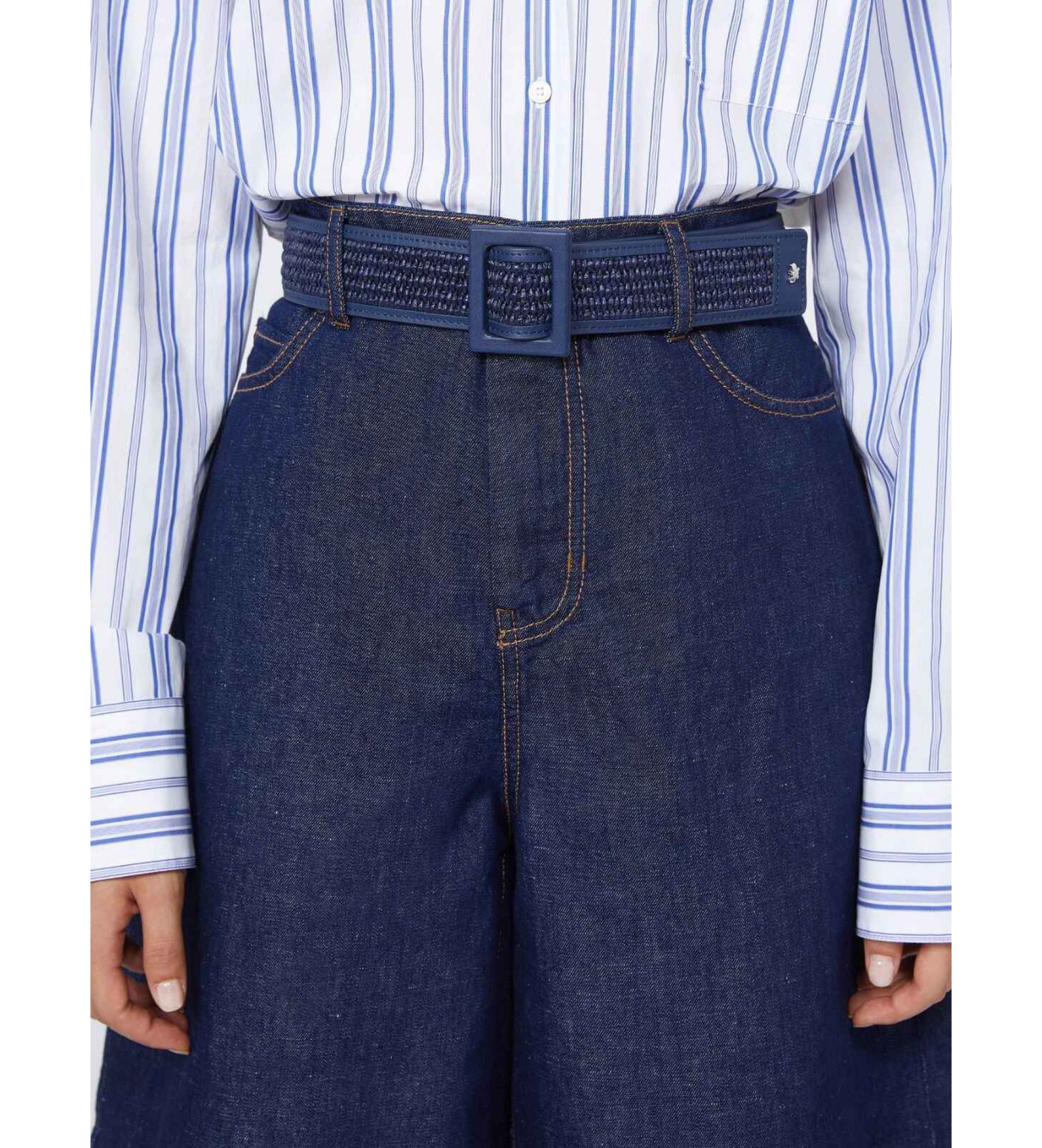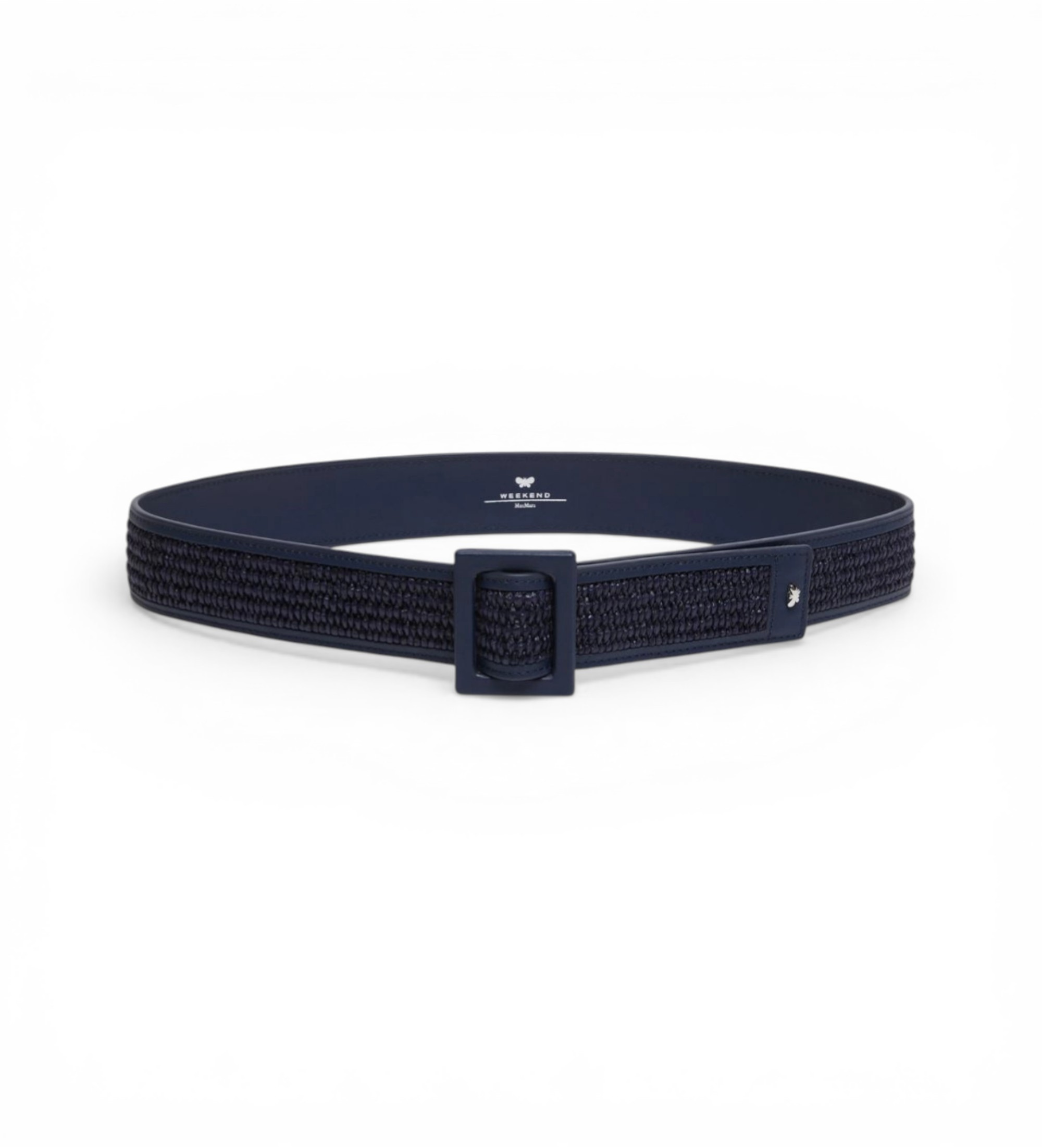 Cinturón con una característica textura tejida con efecto cesta, rematado con un logotipo de mariposa metálica aplicado en la punta.