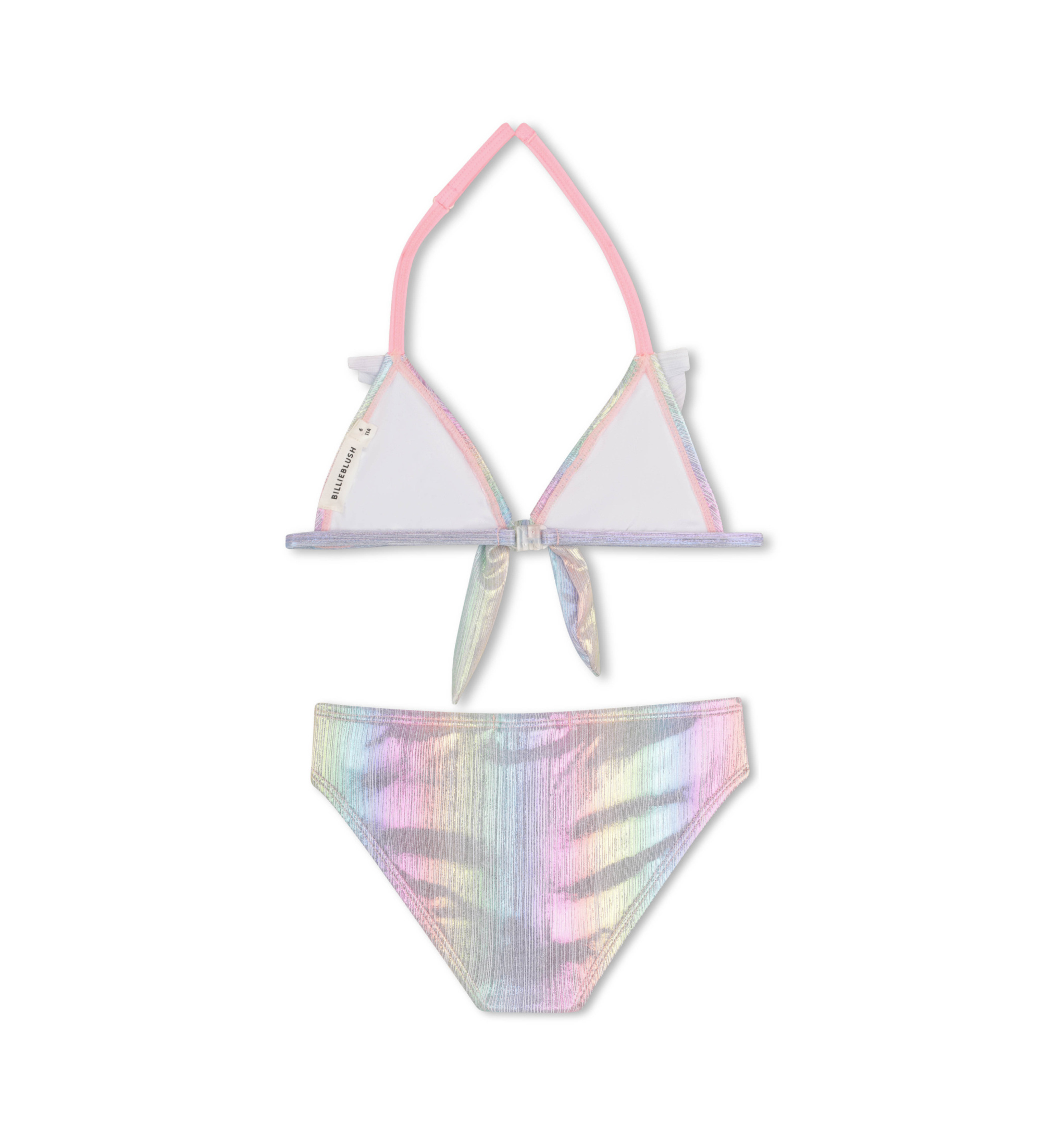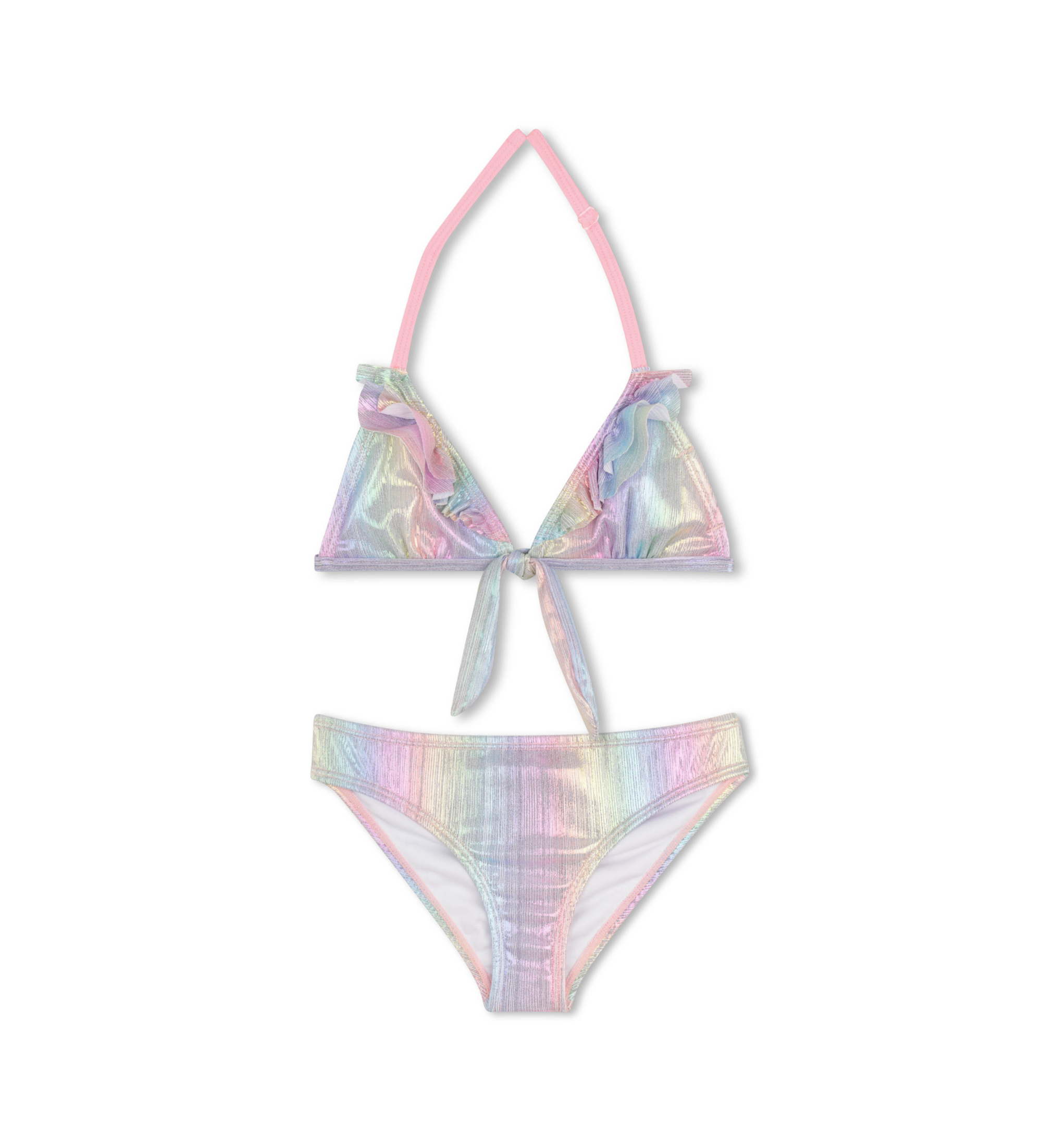 Haut de bikini brillant avec bretelles réglables, volants et n?ud décoratif. Un maillot de bain sophistiqué et féminin qui allie la brillance du tissu à des détails romantiques pour un look de plage élégant et plein de personnalité.