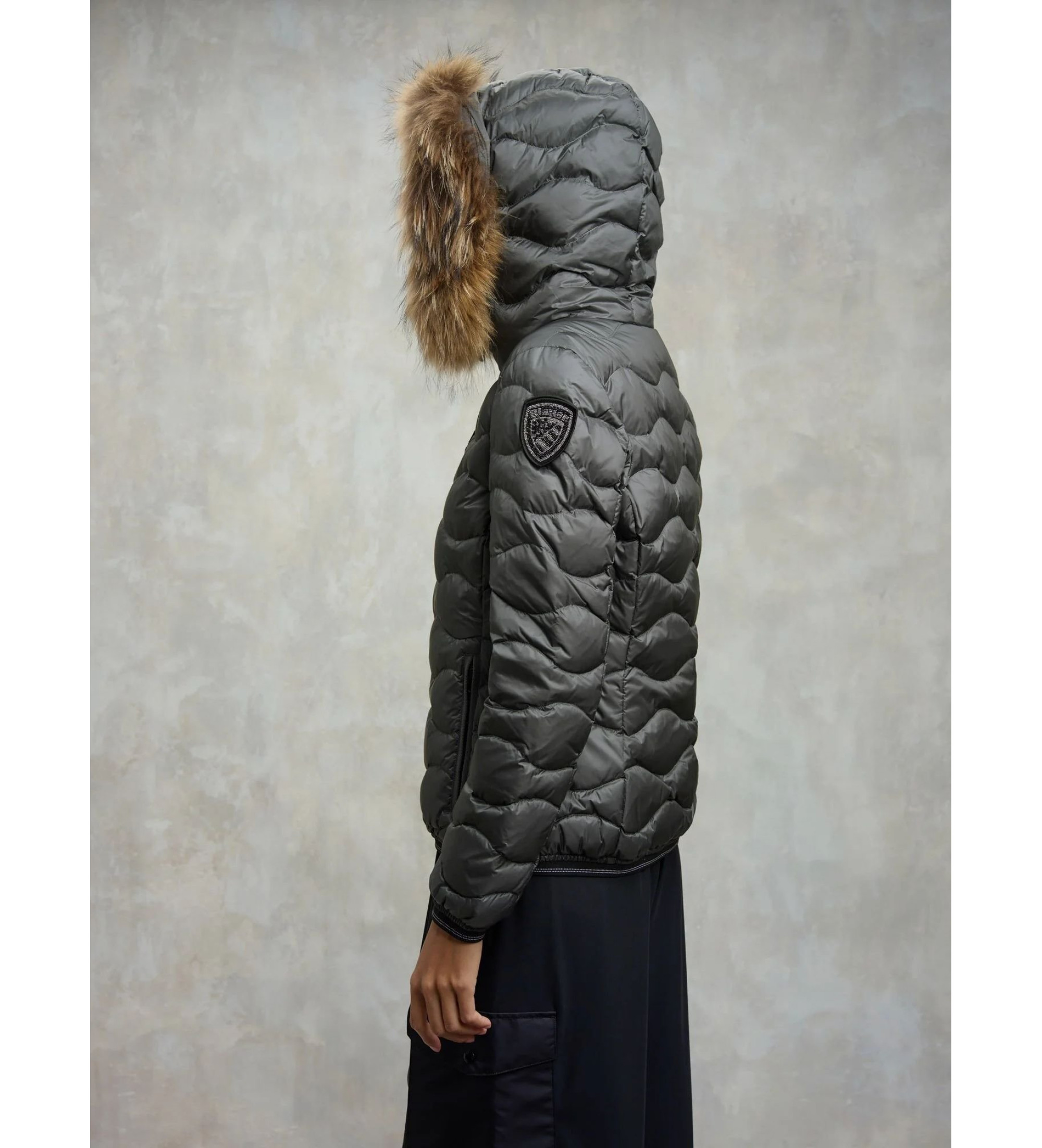 Veste en duvet matelassé déperlant avec matelassage en vagues horizontales et garniture en duvet véritable sur la capuche. Un vêtement emblématique de Blauer avec un matelassage naturel, chaud et compact pour un look moderne.