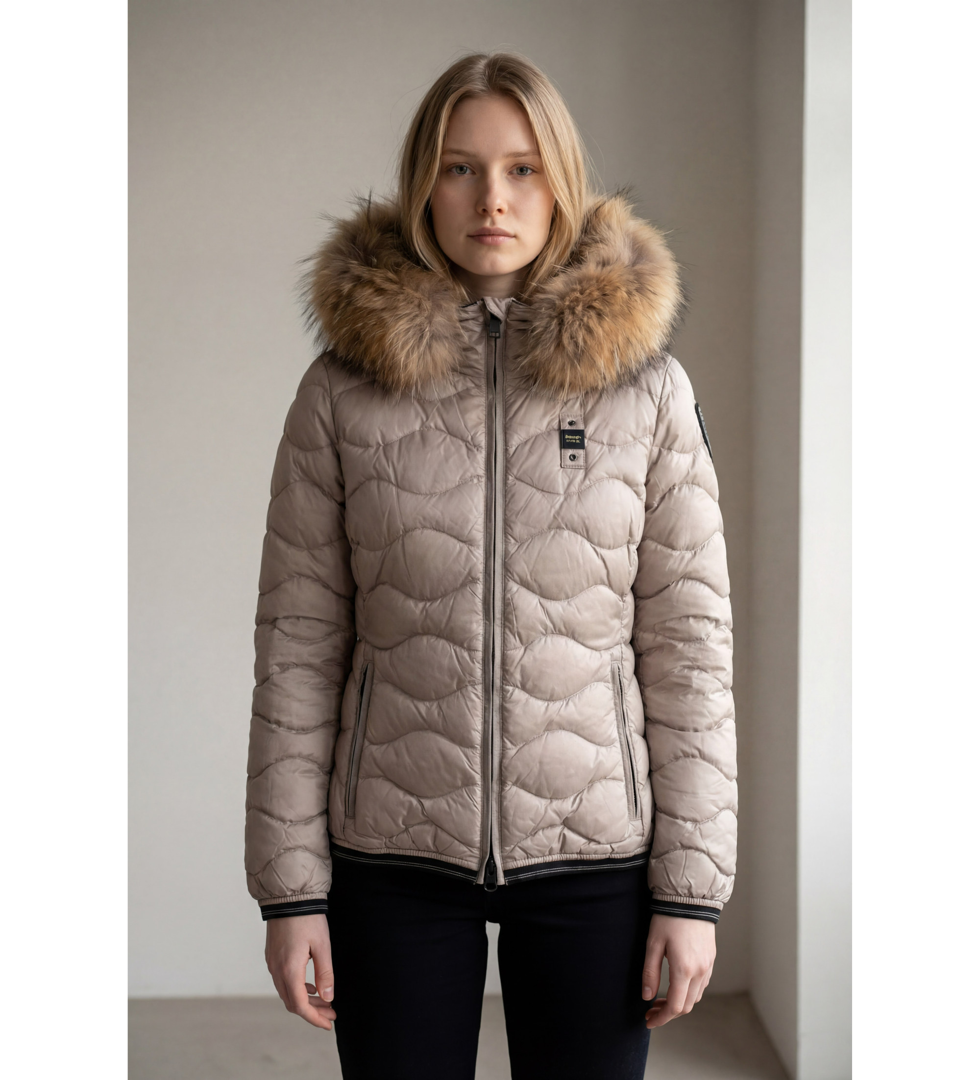 Veste en duvet matelassé déperlant avec matelassage en vagues horizontales et garniture en duvet véritable sur la capuche. Un vêtement emblématique de Blauer avec un matelassage naturel, chaud et compact pour un look moderne.