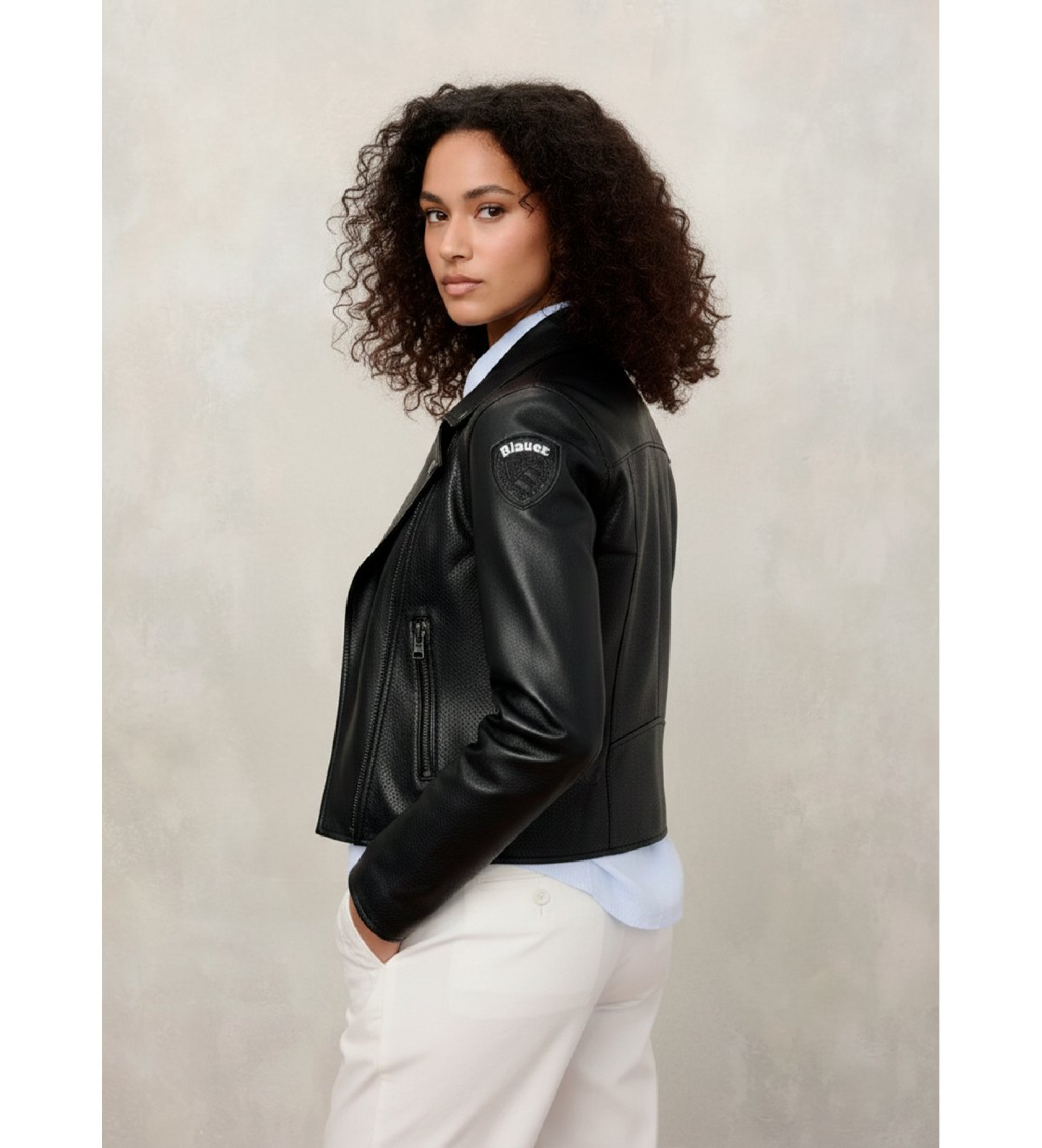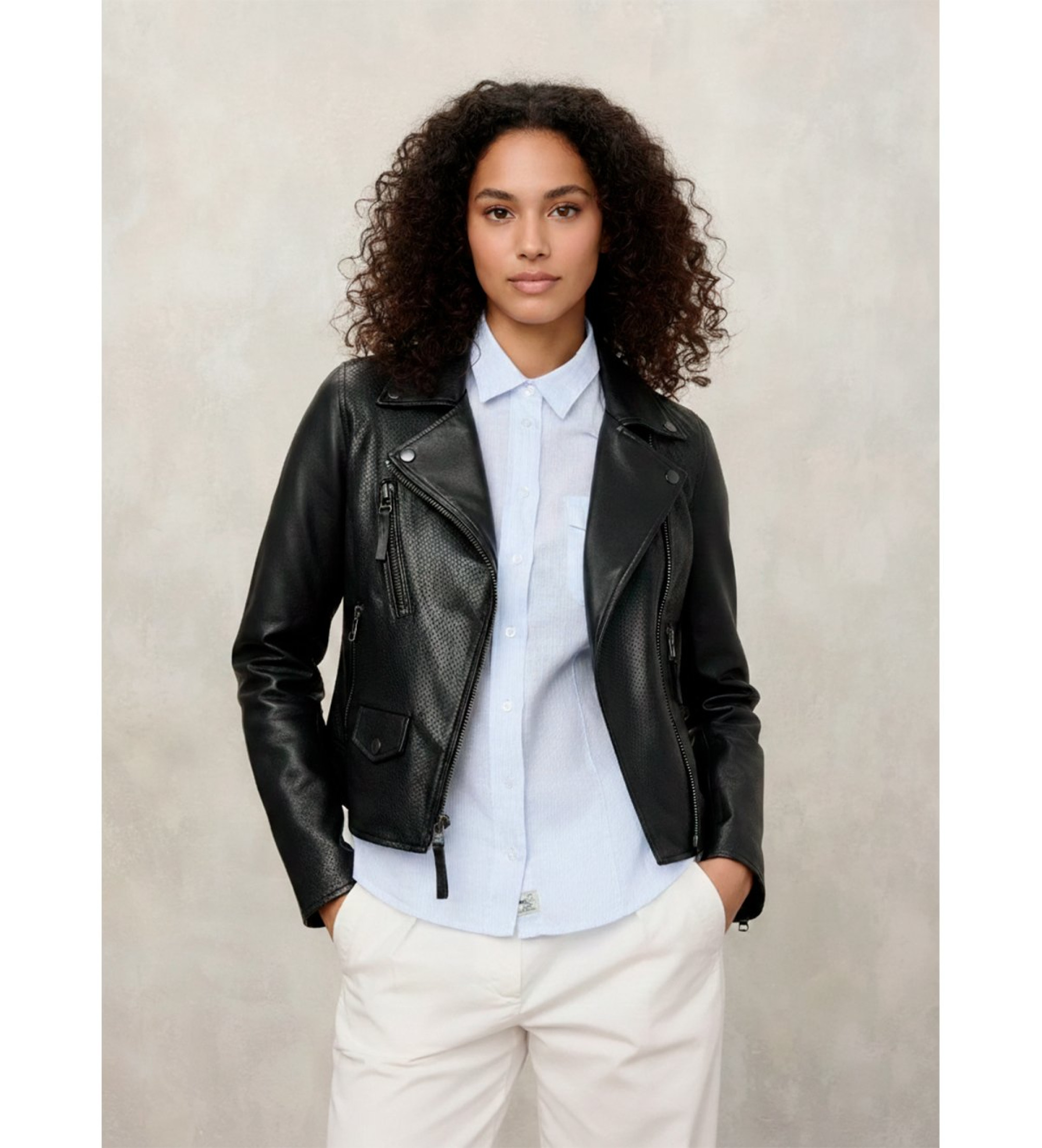 Veste en cuir perforé avec détails en cuir lisse et deux pattes réglables avec boucle sur les côtés. Doux, respirant, élégant et confortable.