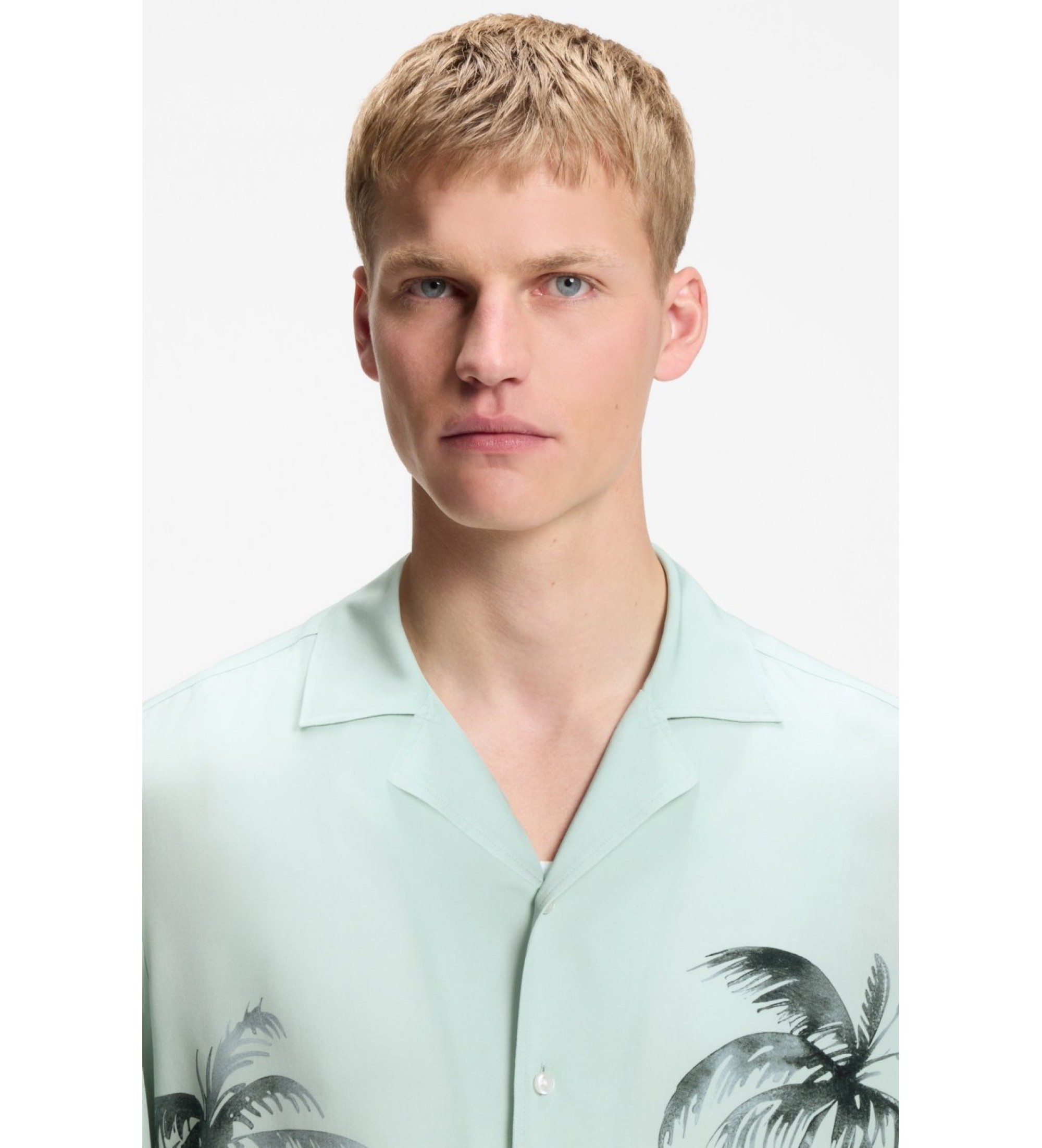Chemise masculine de coupe régulière en tissu fluide 100 % viscose. Elle présente un imprimé à grande échelle sur fond turquoise pour une sensation fraîche et contemporaine. La silhouette regular fit offre une coupe décontractée et confortable pour des looks décontractés à l'esthétique naturelle et sans contrainte.