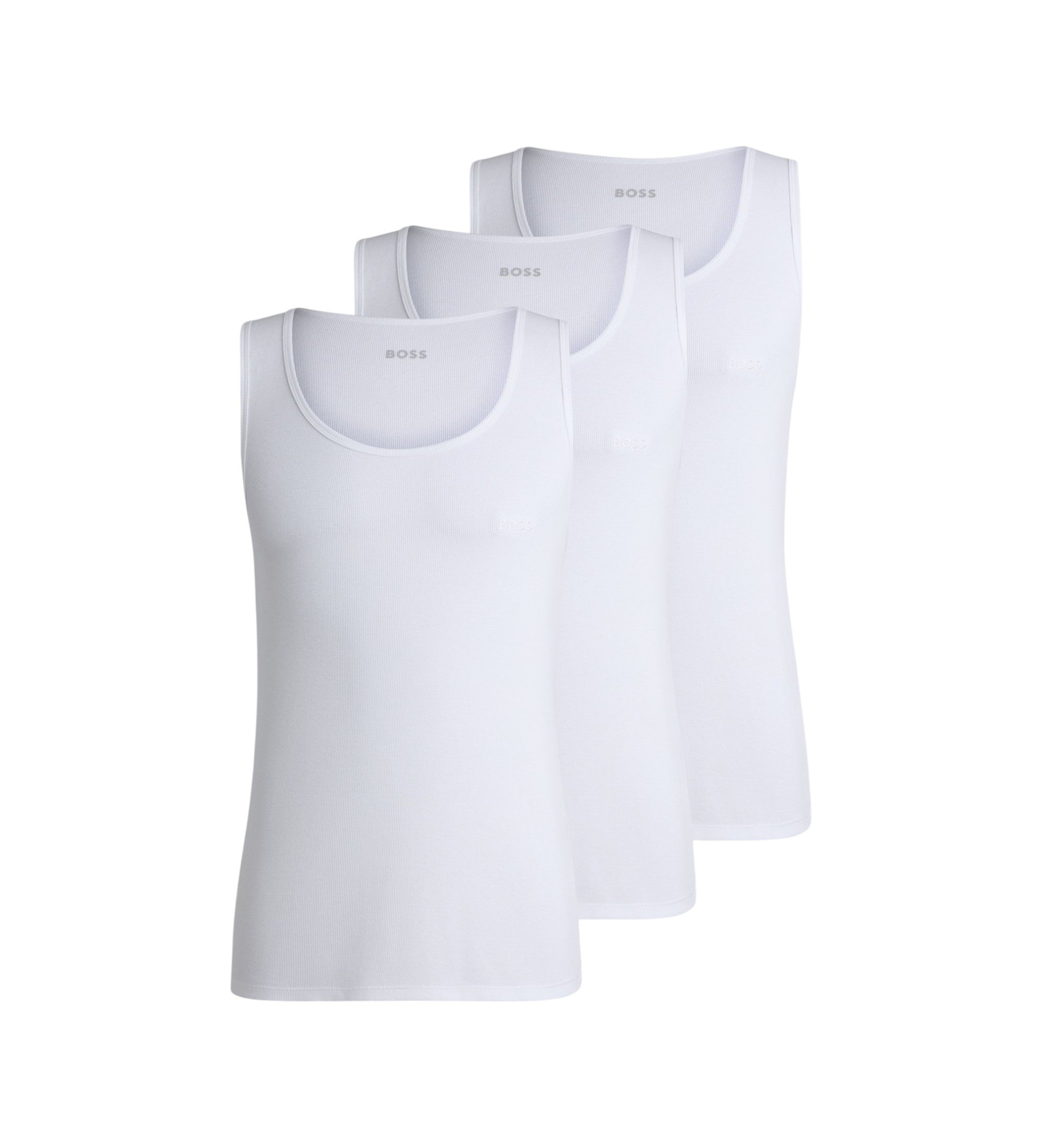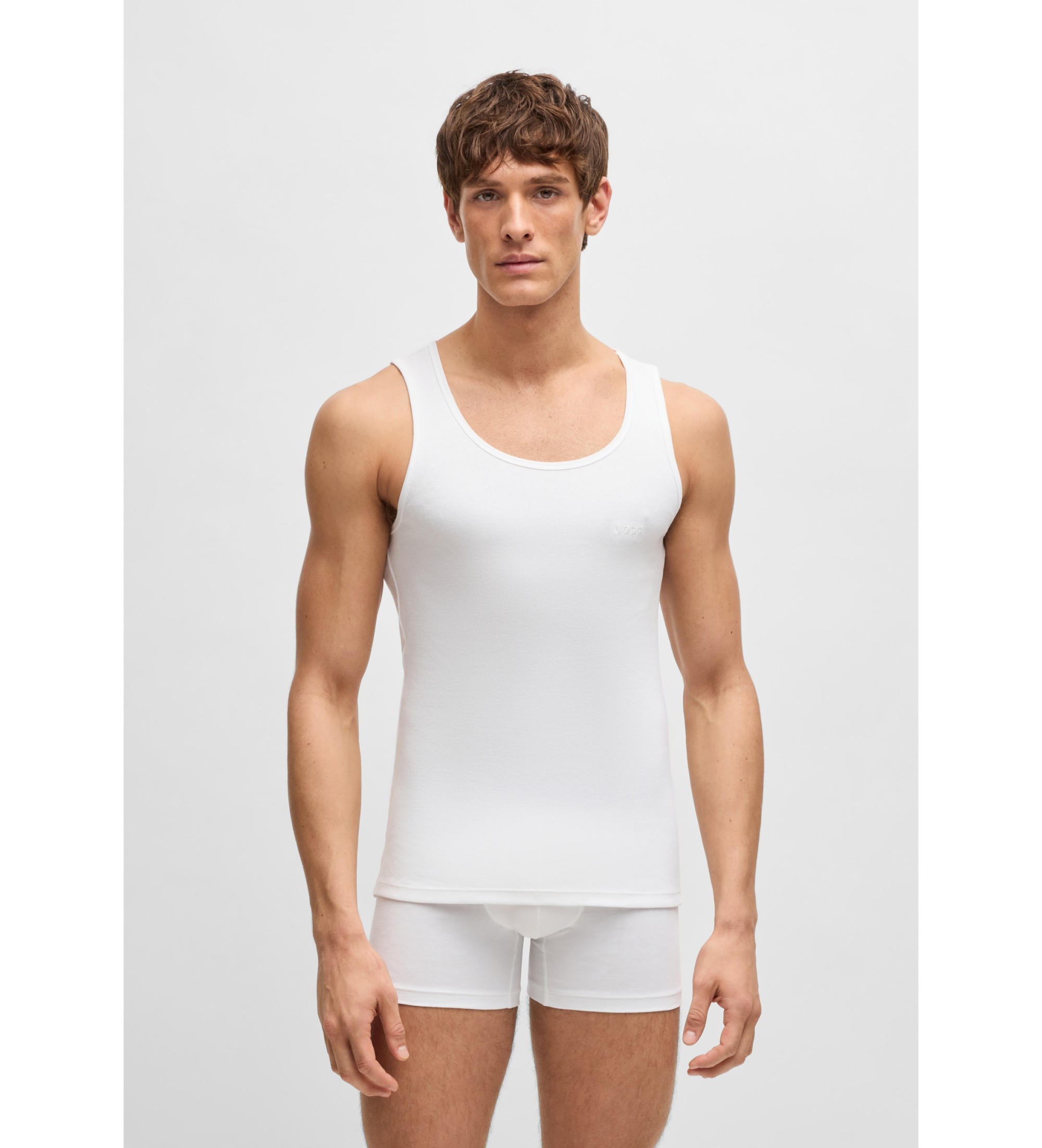Ces débardeurs BOSS Menswear à coupe droite sont le parfait basique de tous les jours. Fabriqués en coton côtelé respirant. Logo brodé ton sur ton. David Beckham est l'égérie de la nouvelle campagne de sous-vêtements BOSS ONE.