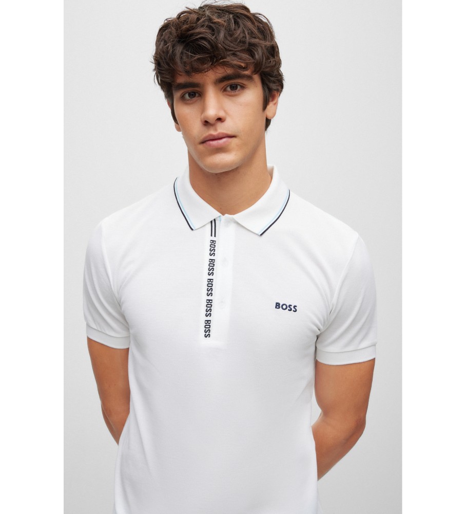 Un polo à la coupe caractéristique de BOSS Menswear. Avec un logo BOSS sur la poitrine gauche et un marquage vertical sur la patte de boutonnage, ce polo à manches courtes est conçu en piqué Oxford fabriqué avec du coton Pima pour un confort respirant. Le bord du col est détaillé avec des pointes rayées pour une touche sportive supplémentaire.