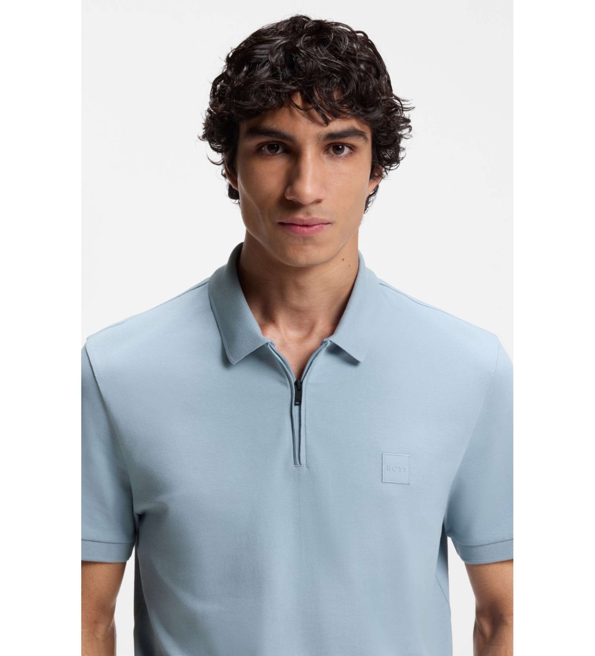 Polo slim conçu pour l'homme à la recherche d'un look contemporain et naturel. Confectionné en piqué de coton extensible bleu pastel, il est doté d'une patte de boutonnage zippée pour une touche moderne et fonctionnelle. L'écusson discret du logo sur la poitrine complète un profil propre et raffiné, parfait pour les looks de tous les jours avec une sensation sophistiquée et confortable.
