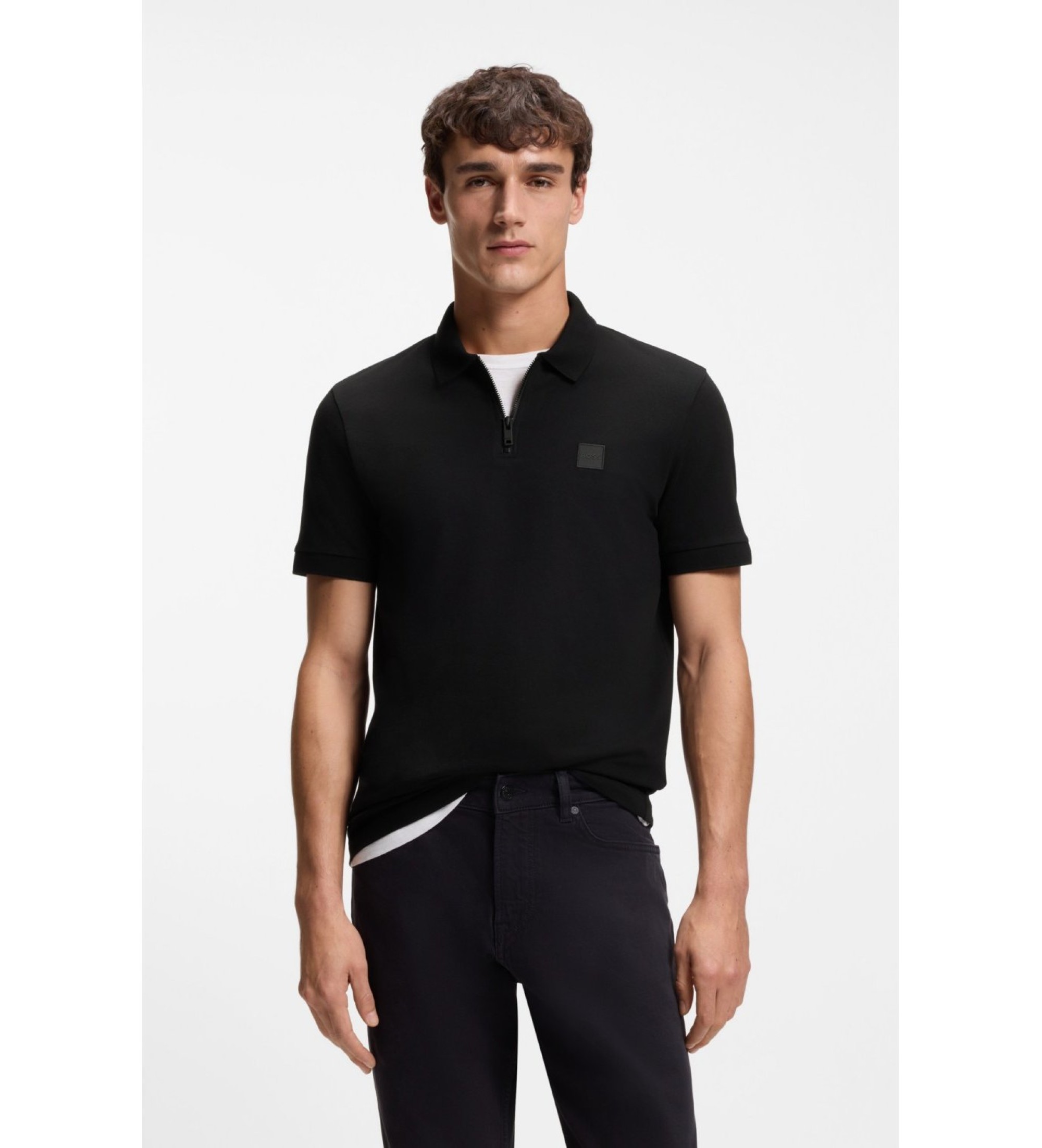 Polo slim fit noir pour homme en coton piqué extensible pour le confort et une coupe nette. La patte de boutonnage zippée ajoute de la fonctionnalité et une touche contemporaine, tandis que l'écusson du logo sur la poitrine maintient une esthétique raffinée et discrète. Avec ses manches courtes et ses finitions soignées, il s'agit d'une pièce polyvalente pour les looks quotidiens qui recherchent la simplicité et la qualité des matériaux.