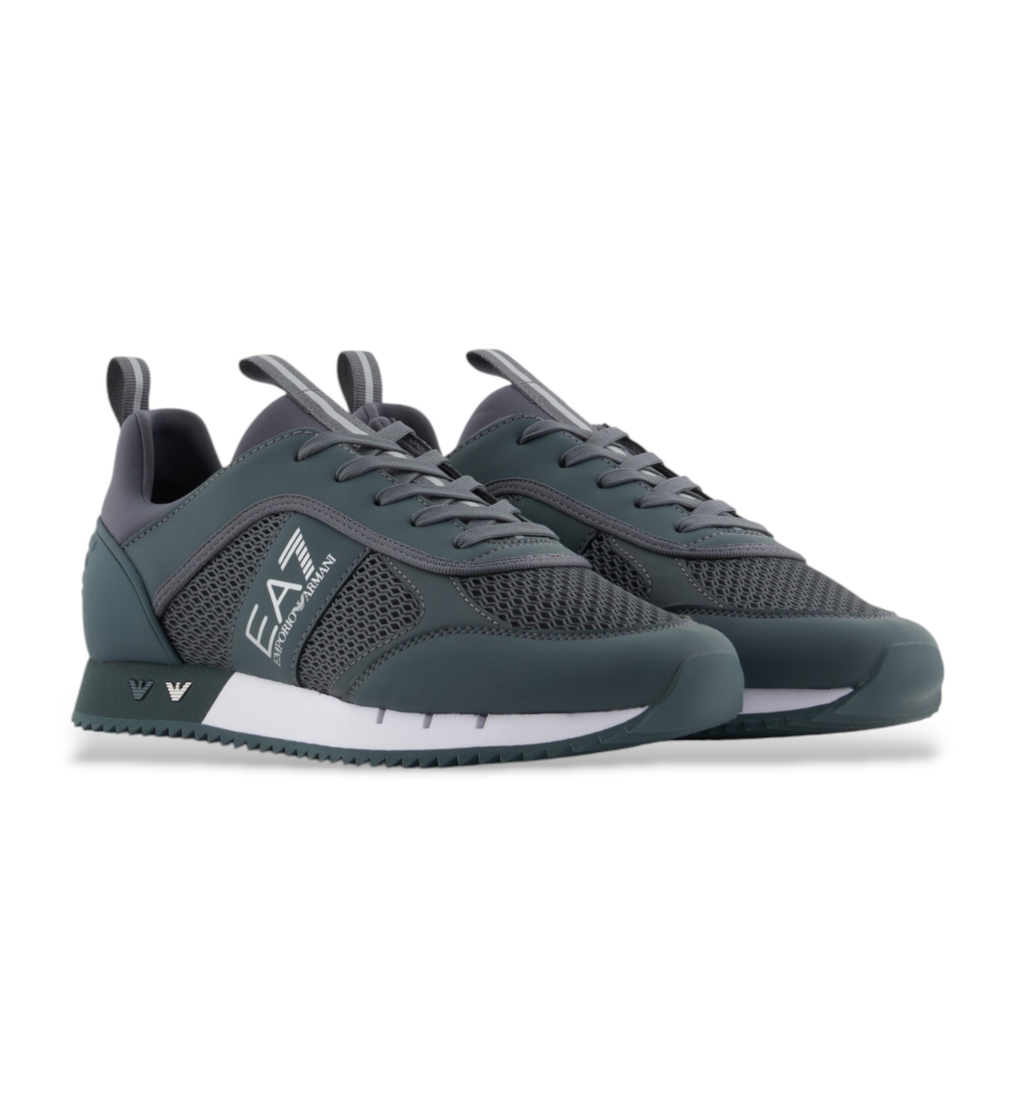 Chaussure de sport Lifestyle avec tige en mesh et empiècements en lycra. Logo EA7 sur le côté. Aigles métalliques sur la semelle intermédiaire. Bande réfléchissante sur les lacets. Grand aigle embossé sur la languette du talon.