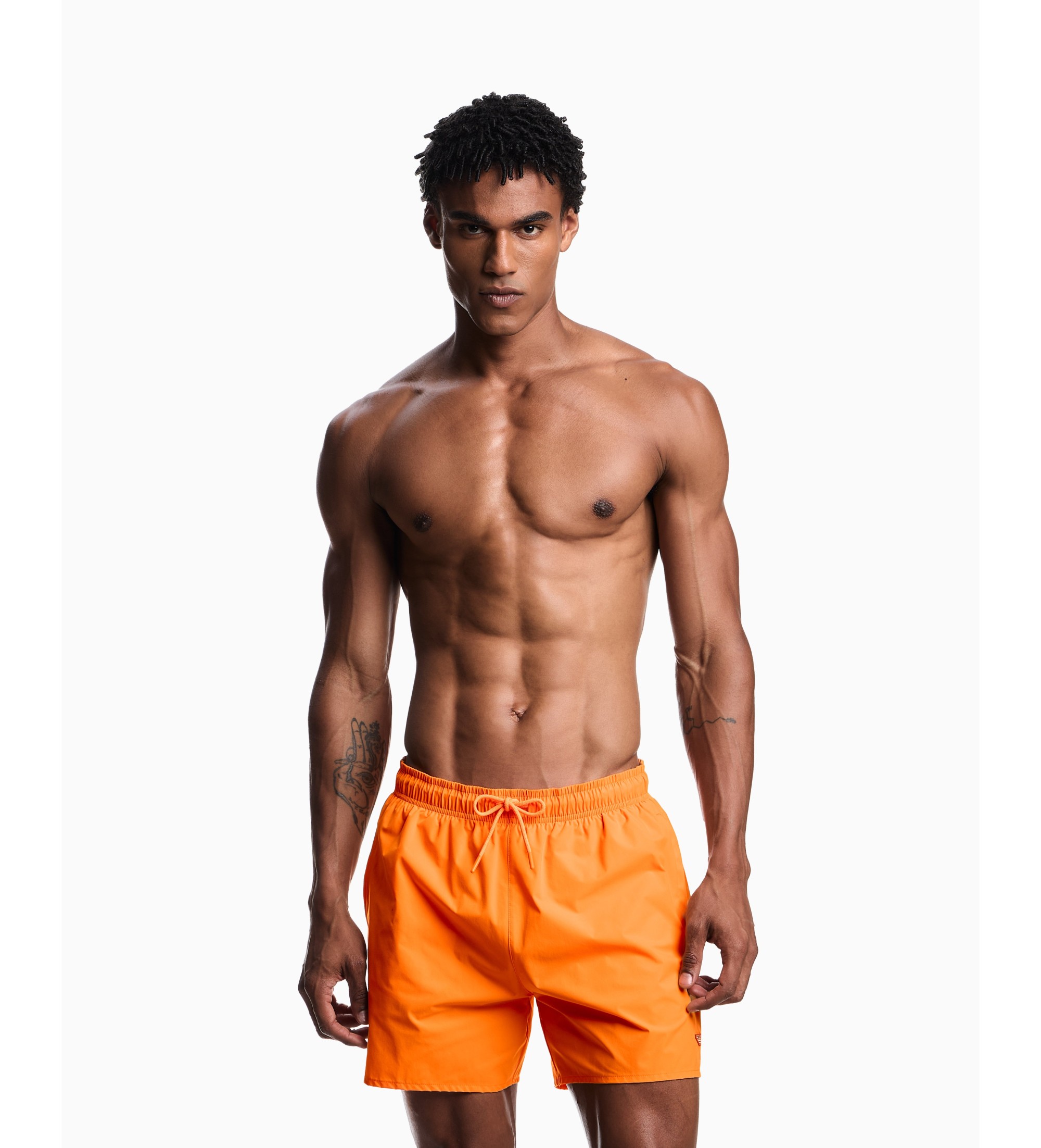 Caleçon de plage orange pour homme. Conception de lignes essentielles en tissu essentiel : 100% polyester. Une proposition de maillot de bain à l'esthétique épurée et aux couleurs vives, conçue pour ceux qui recherchent une pièce fonctionnelle et contemporaine.