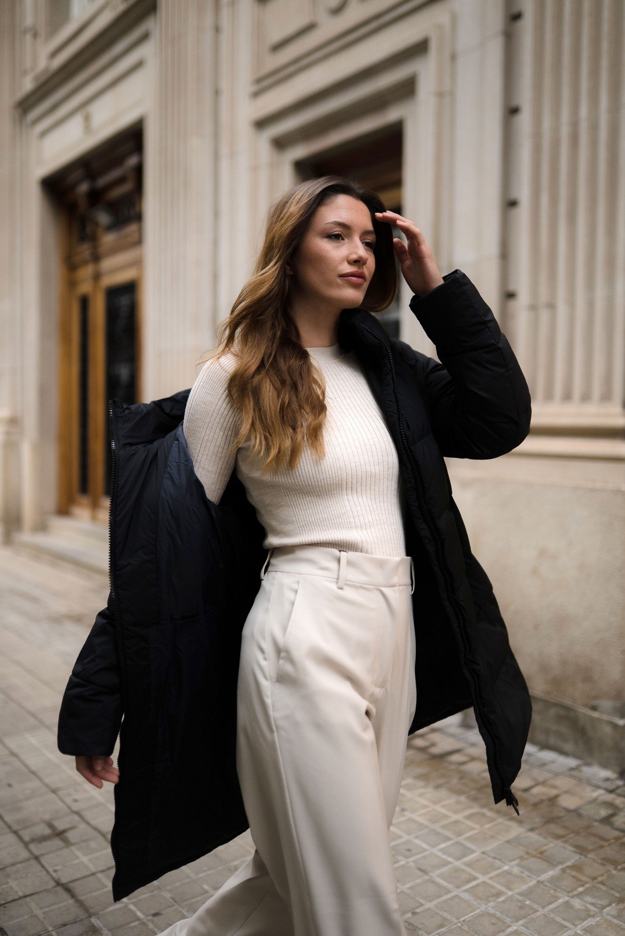 - Contrastes délibérés : Combiner un manteau texturé avec un fond clair crée un dialogue visuel équilibré.