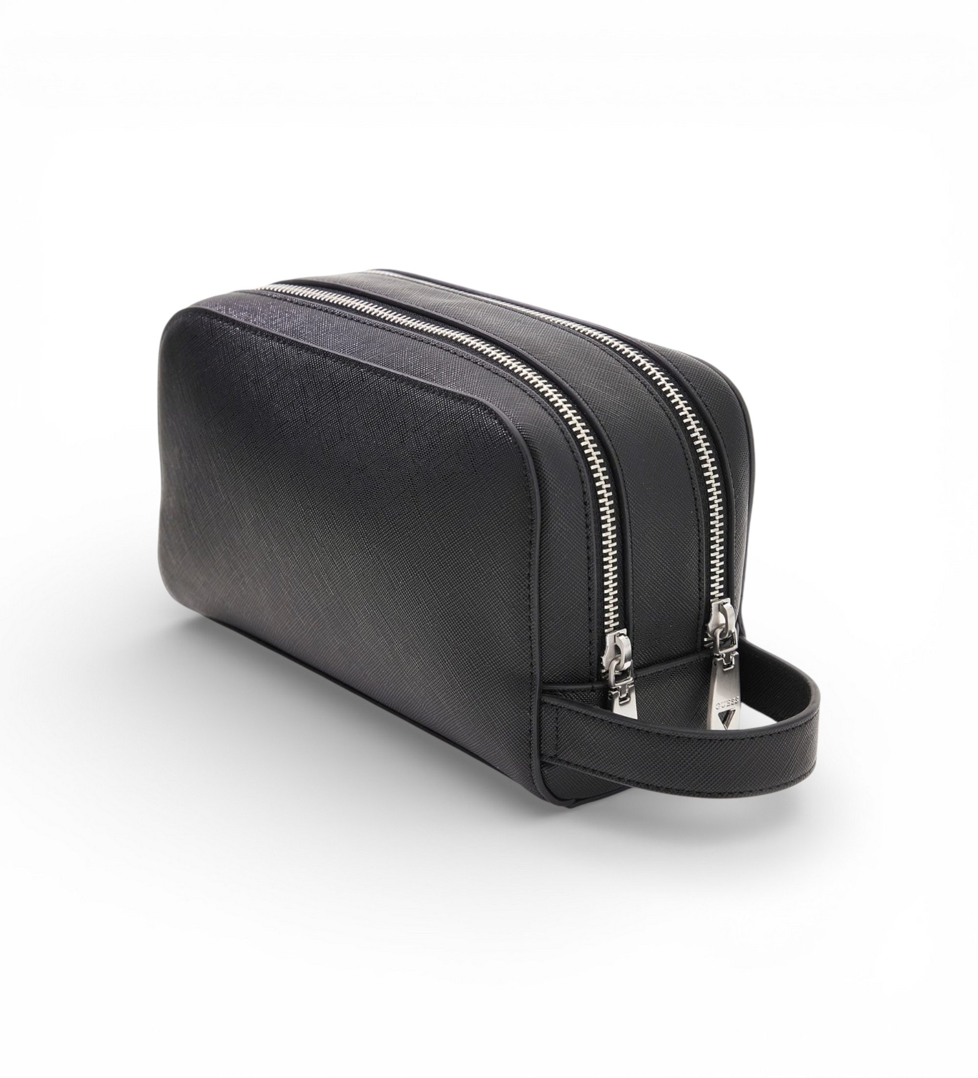 La trousse de toilette Milano en noir, fabriquée en similicuir texturé Saffiano, allie élégance et fonctionnalité. Elle est dotée d'une fermeture à glissière intégrale et de compartiments bien organisés pour garder vos effets personnels en sécurité.