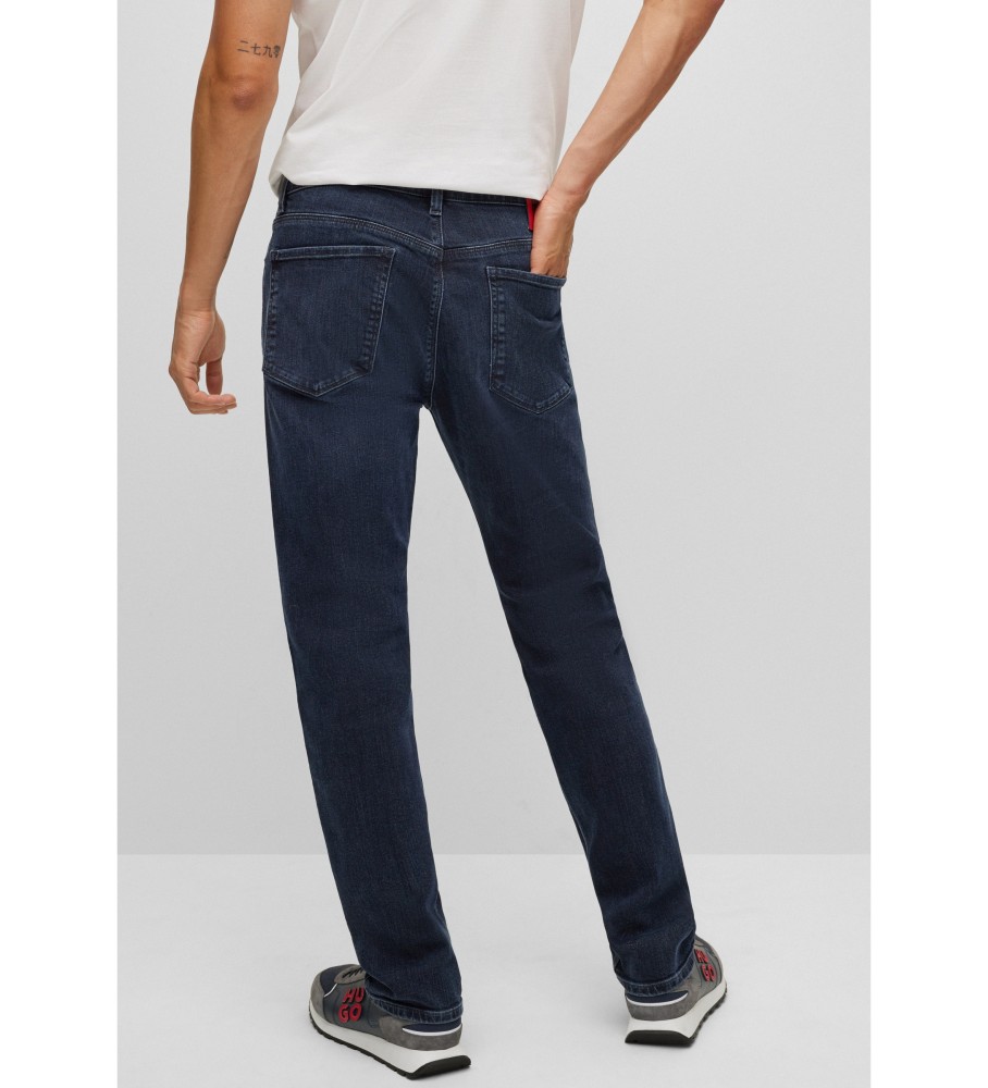 Jean HUGO homme polyvalent à taille moyenne. Ce jean à cinq poches présente des garnitures de marque, telles qu'un patch logo en rouge HUGO, et est confectionné en denim stretch bleu-noir. Cette pièce contemporaine présente une coupe distinctive avec une jambe droite.