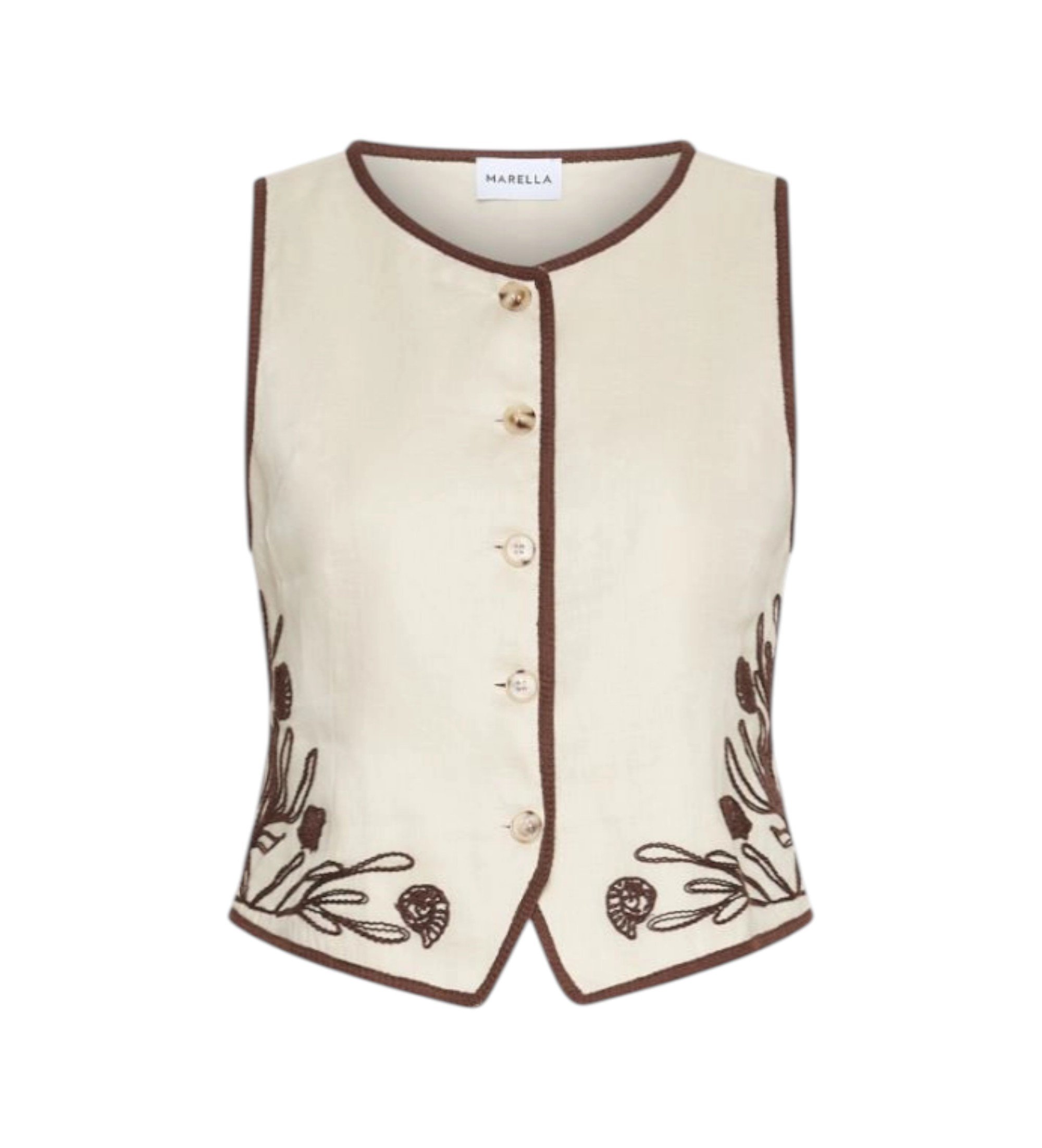 Ce nouveau gilet en pur lin, décoré de bordures et de broderies de couleur contrastée, peut être porté sans rien en dessous comme un haut sans manches. Il est doublé pour un confort tout au long de la journée.