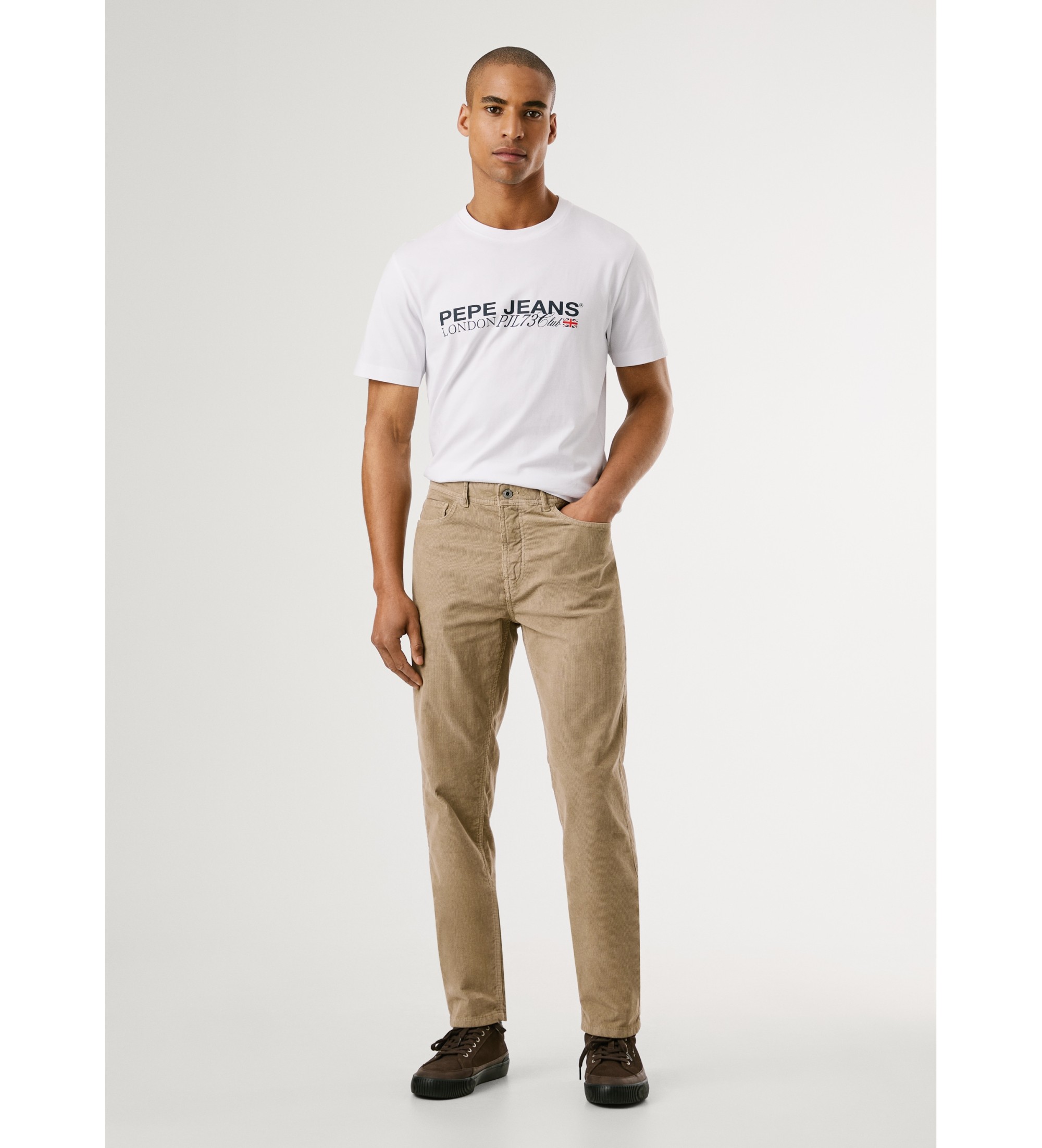Pantalon chino en velours côtelé extensible avec une coupe étroite pour un style moderne et ajusté. Conçu avec un style pratique à cinq poches, il est doté d'une fermeture à glissière et d'un bouton. Les poches arrière sont ornées de surpiqûres et la teinture au lavage réactif lui confère une finition particulière. Un logo PEPEJEANS en cuir est apposé sur la ceinture arrière pour compléter le design. Ce vêtement est fabriqué à partir d'au moins 70 % de coton durable.