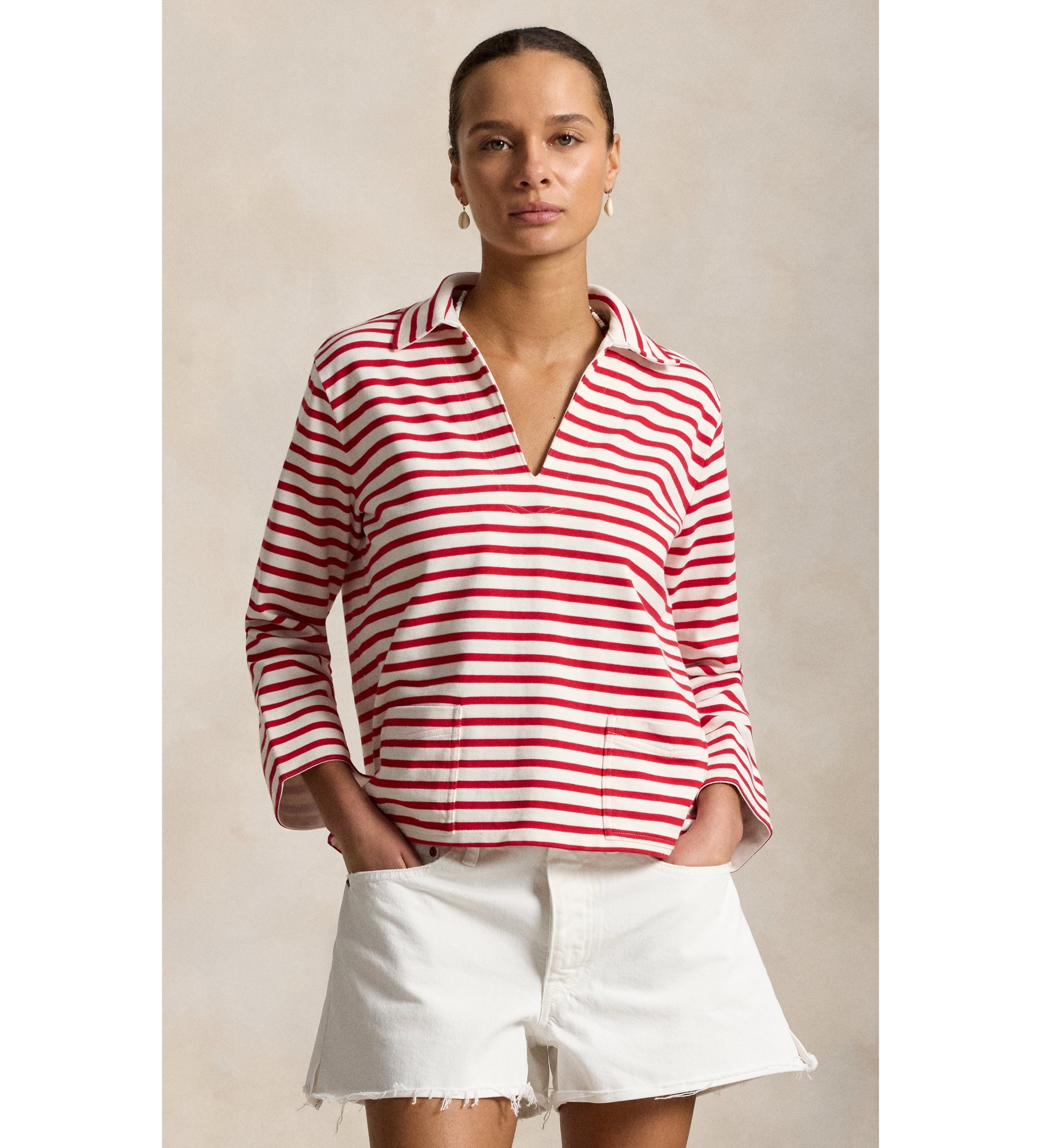 Confectionné en jersey de coton, ce t-shirt marin associe un imprimé à rayures teintées dans la masse à un col et une patte de boutonnage d'inspiration nautique. Il est orné de notre logo brodé et d'une étiquette tissée.