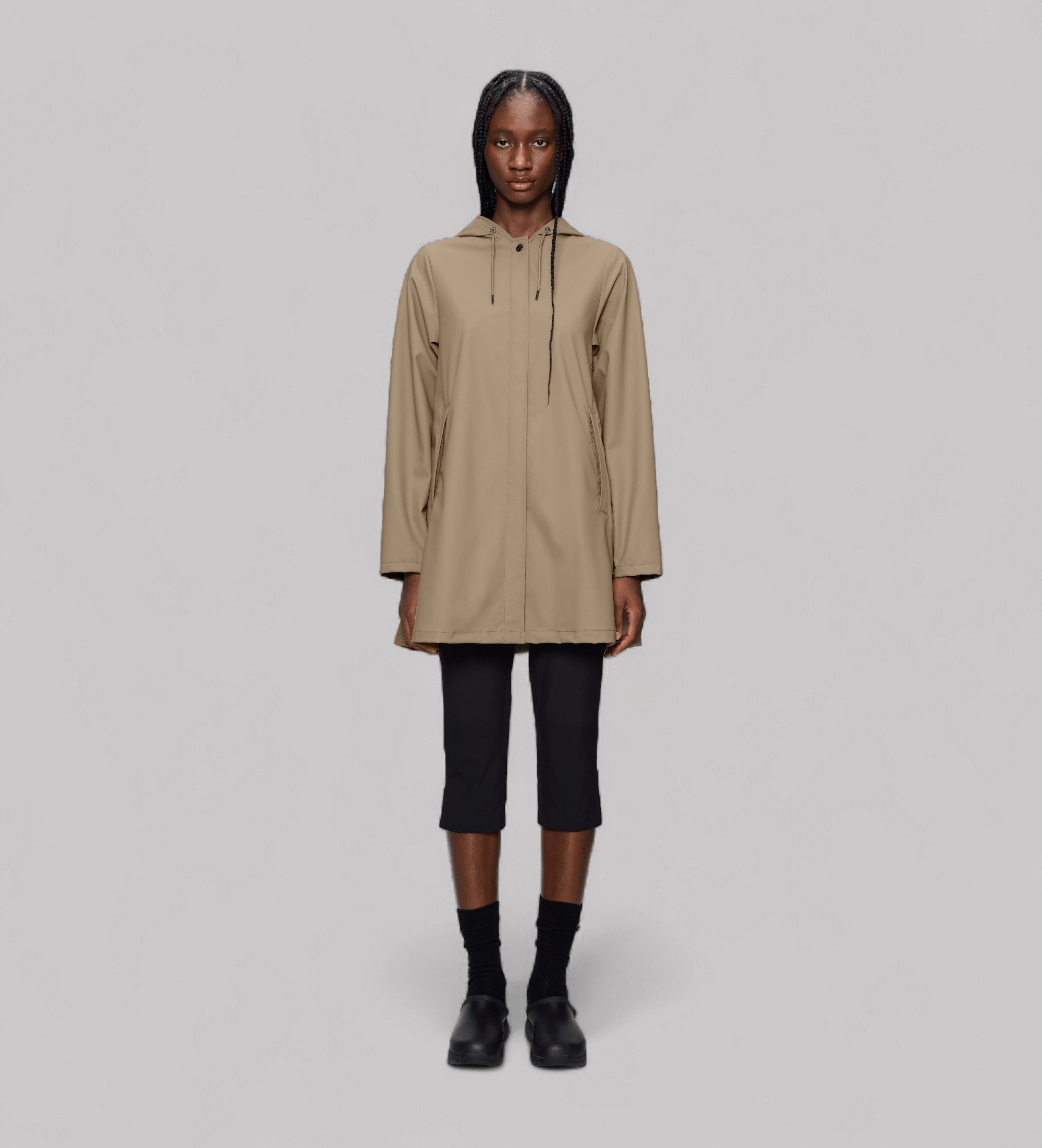 La A-Line Jacket est une veste imperméable pour femme qui se caractérise par sa silhouette en forme de A et son design élégant. La veste A-Line W offre un toucher doux et léger et un drapé élégant dont le volume augmente progressivement de la poitrine à l'ourlet. Elle est dotée d'une capuche à cordon de serrage avec visière intégrée, de deux poches latérales et de poignets réglables par boutons-pression. Ce mackintosh est doté d'une fermeture à boutons-pression dissimulés et d'une patte de boutonnage. Des ?illets sous les bras assurent la ventilation et la respirabilité pour un plus grand confort. La veste A-Line W, fabriquée dans le tissu PU caractéristique de Rains, présente des coutures étanches pour résister à la pluie et au vent. La finition est légère et douce au toucher.