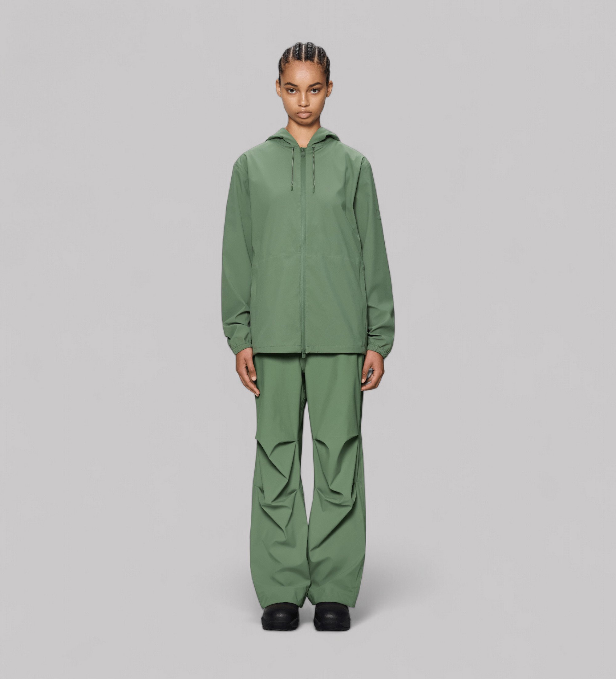La veste est dotée de poches latérales zippées et de poignets élastiques. Une marque caoutchoutée ajoute une touche de contraste à sa finition minimaliste.