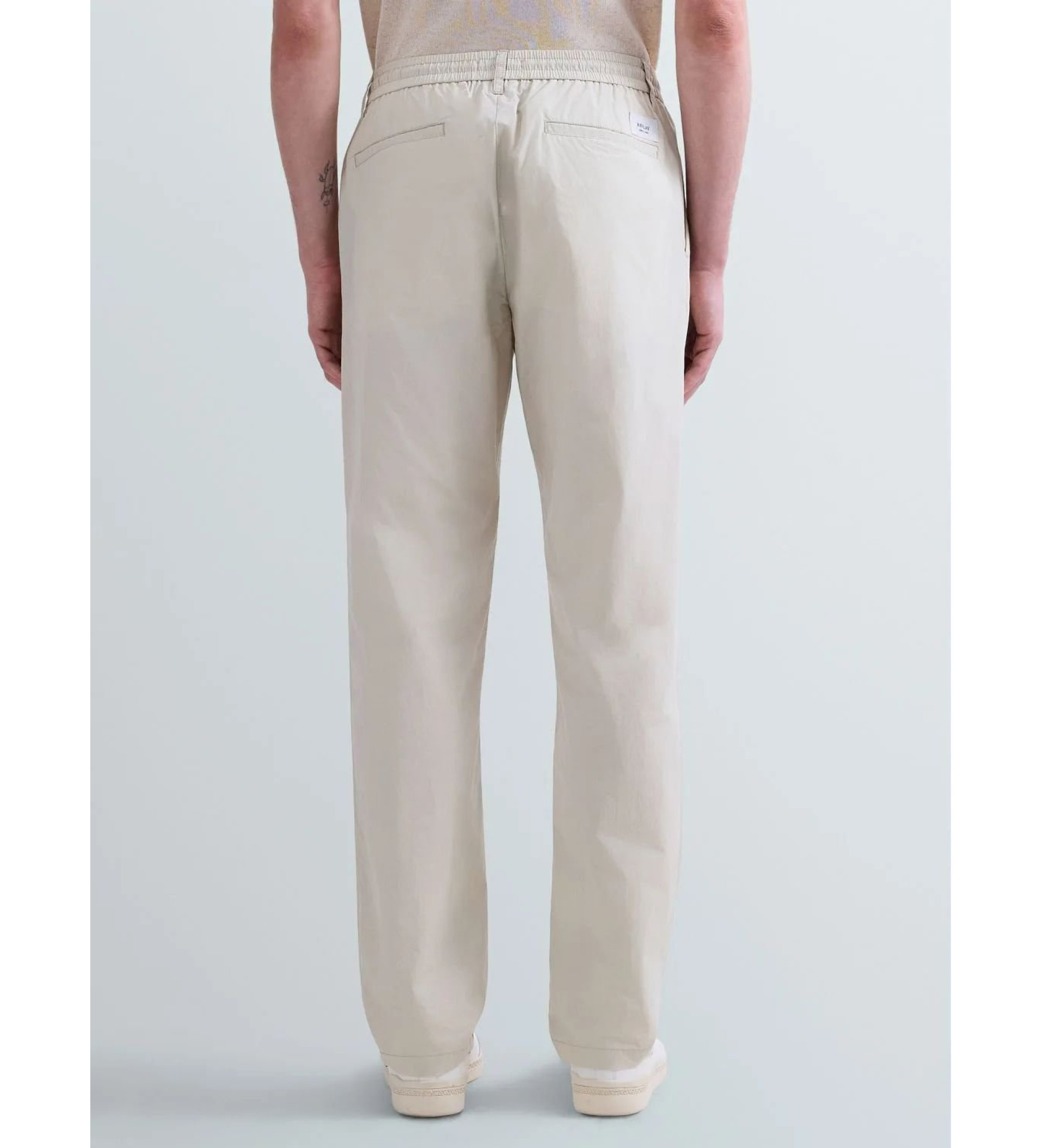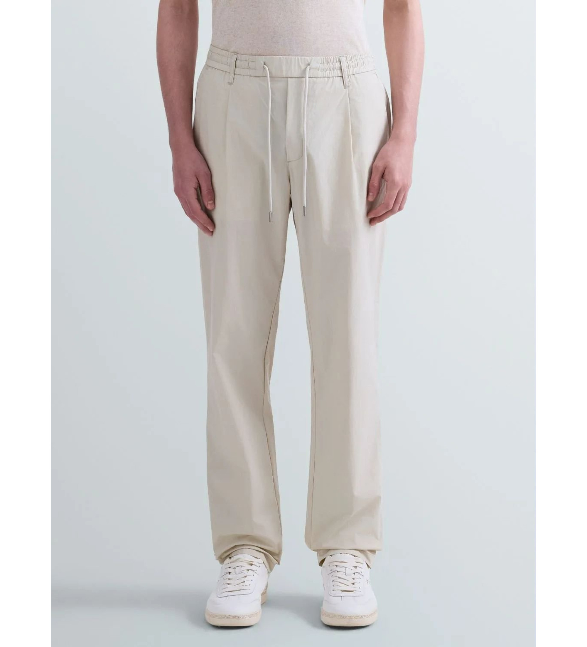 Pantalon fuselé en nylon technique et coton. Il est doté d'une taille élastique à cordon de serrage, de passants de ceinture, de deux poches latérales confortables et de deux poches passepoilées à l'arrière, tandis que le devant est fini par deux pinces élégantes. Une étiquette de marque au dos complète le design.