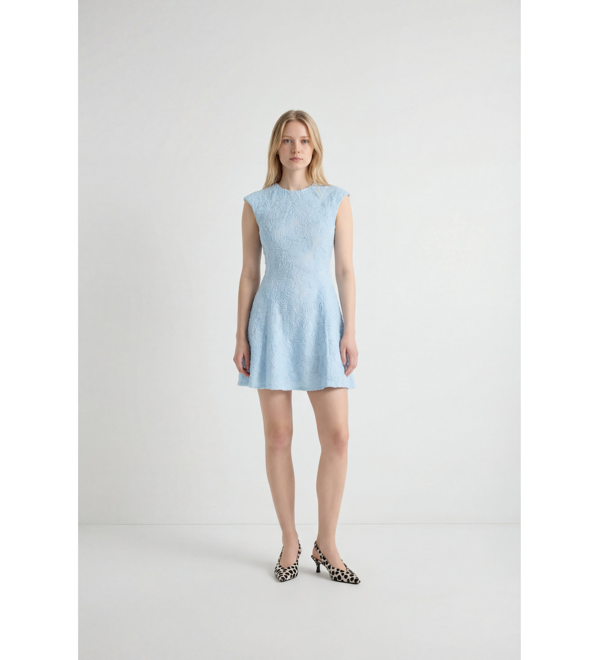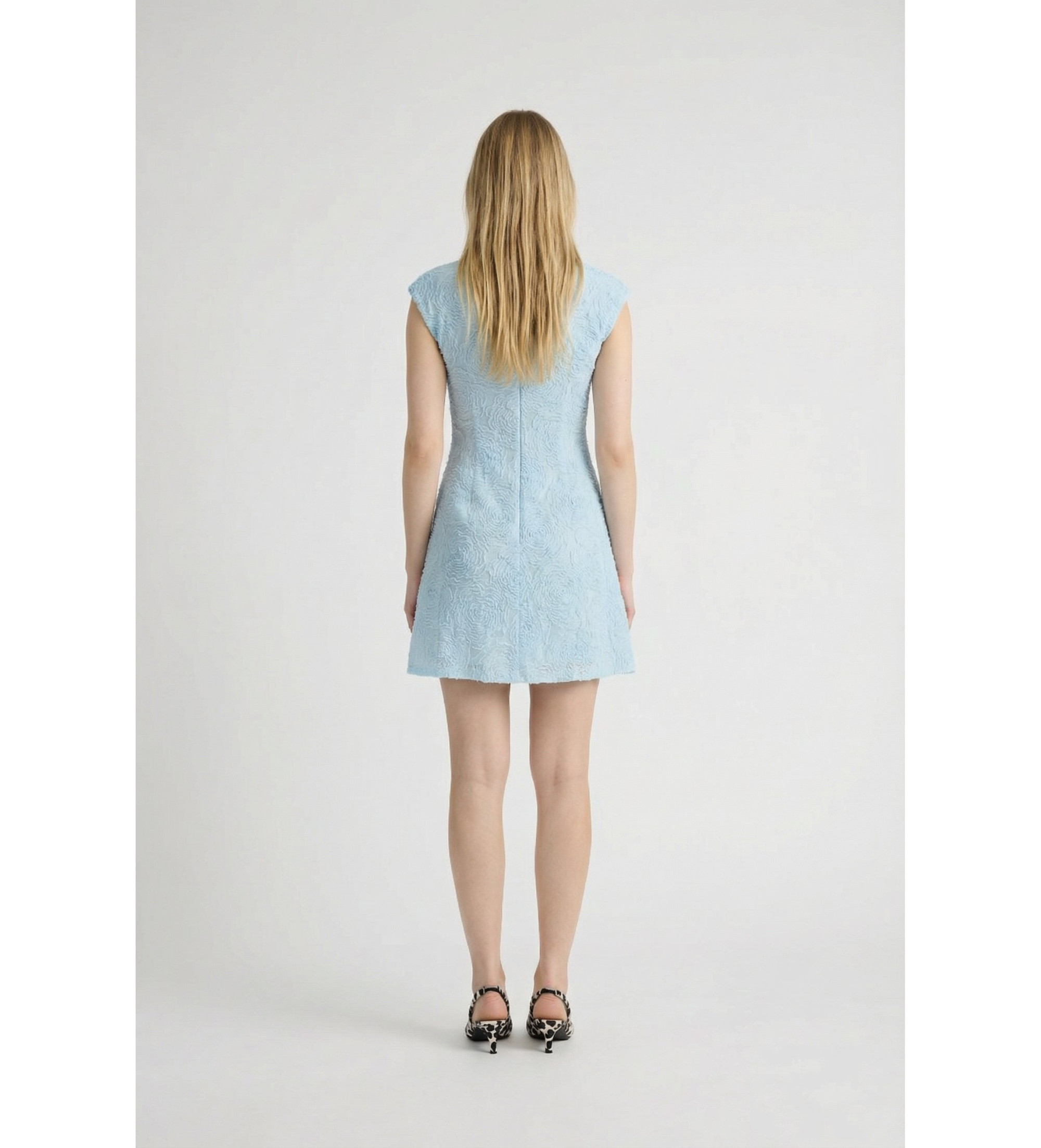 Découvrez la Mesh Mini Dress Blue, une mini robe sans manches qui allie élégance et texture dimensionnelle. Son encolure ronde et sa taille ajustée qui s'évase en une jupe aux formes douces créent une silhouette féminine et flatteuse. La surface en maille texturée à motif floral ajoute de la légèreté et de la profondeur visuelle, tandis que la fermeture à glissière au dos complète le design. Fabriquée en polyester recyclé, cette robe est parfaite pour les occasions spéciales du printemps et de l'été.