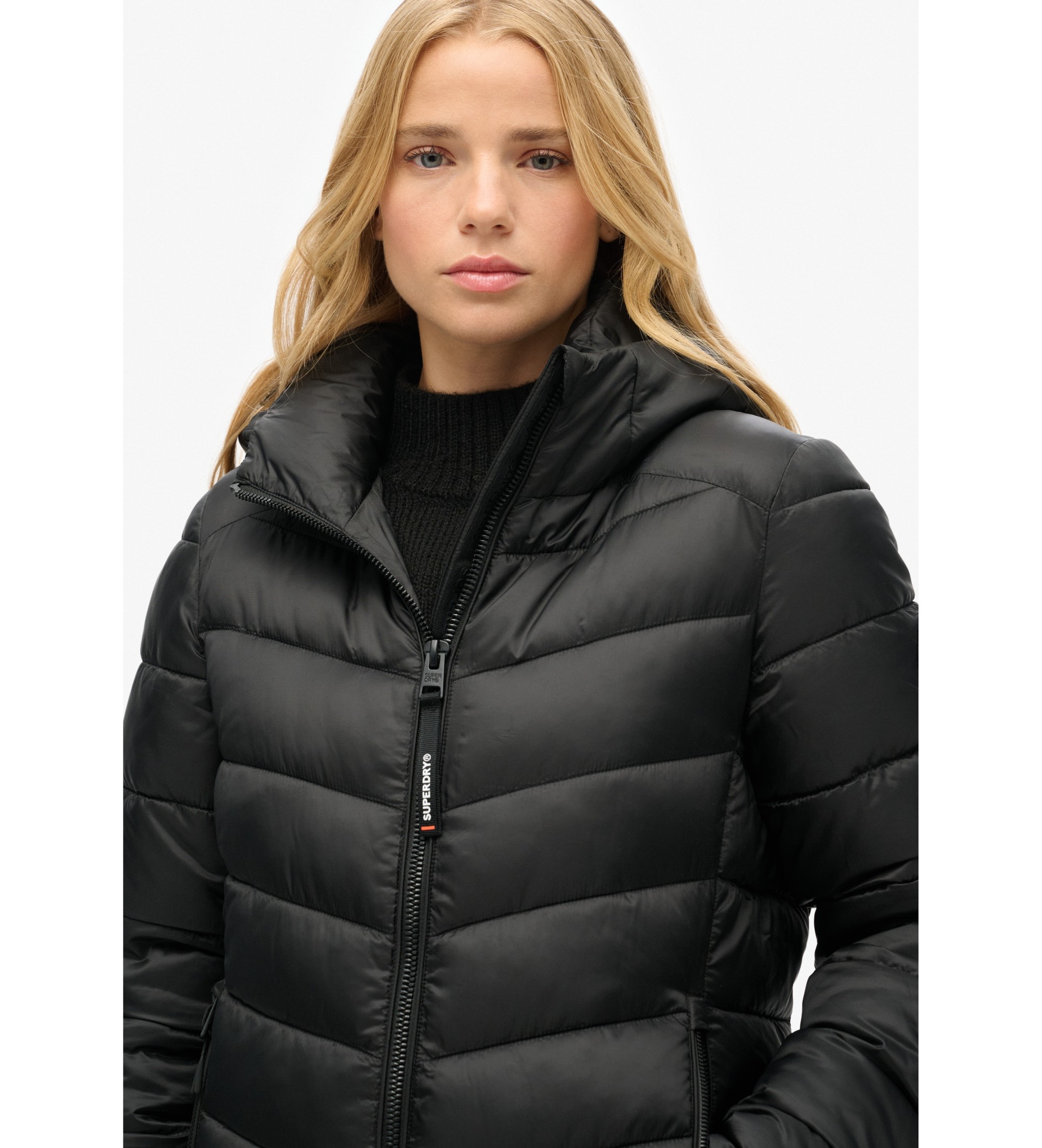 Veste matelassée de taille moyenne avec capuche, parfaite pour la chaleur et le confort par temps froid.