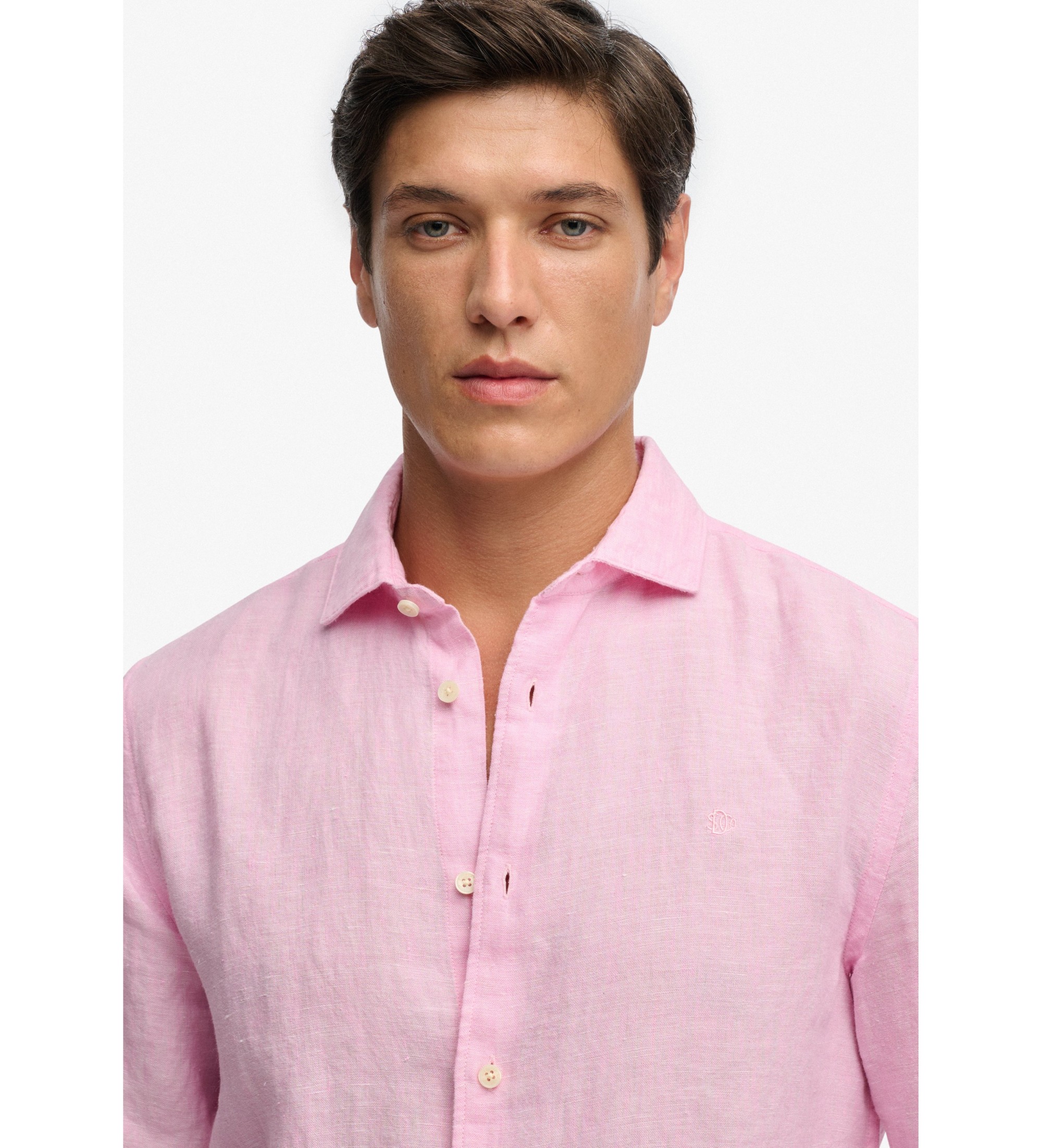 Une chemise en lin à la coupe décontractée conçue pour les hommes. Réalisée en 100 % lin dans une teinte rose, elle offre une coupe classique, ni moulante ni ample. Elle présente un col classique avec fermeture à boutons, des manches longues avec poignets boutonnés et une étiquette distinctive à l'ourlet. Le tissu aéré et le logo brodé sur la poitrine font de ce basique léger une pièce intemporelle et confortable, idéale pour les chaudes journées d'été.