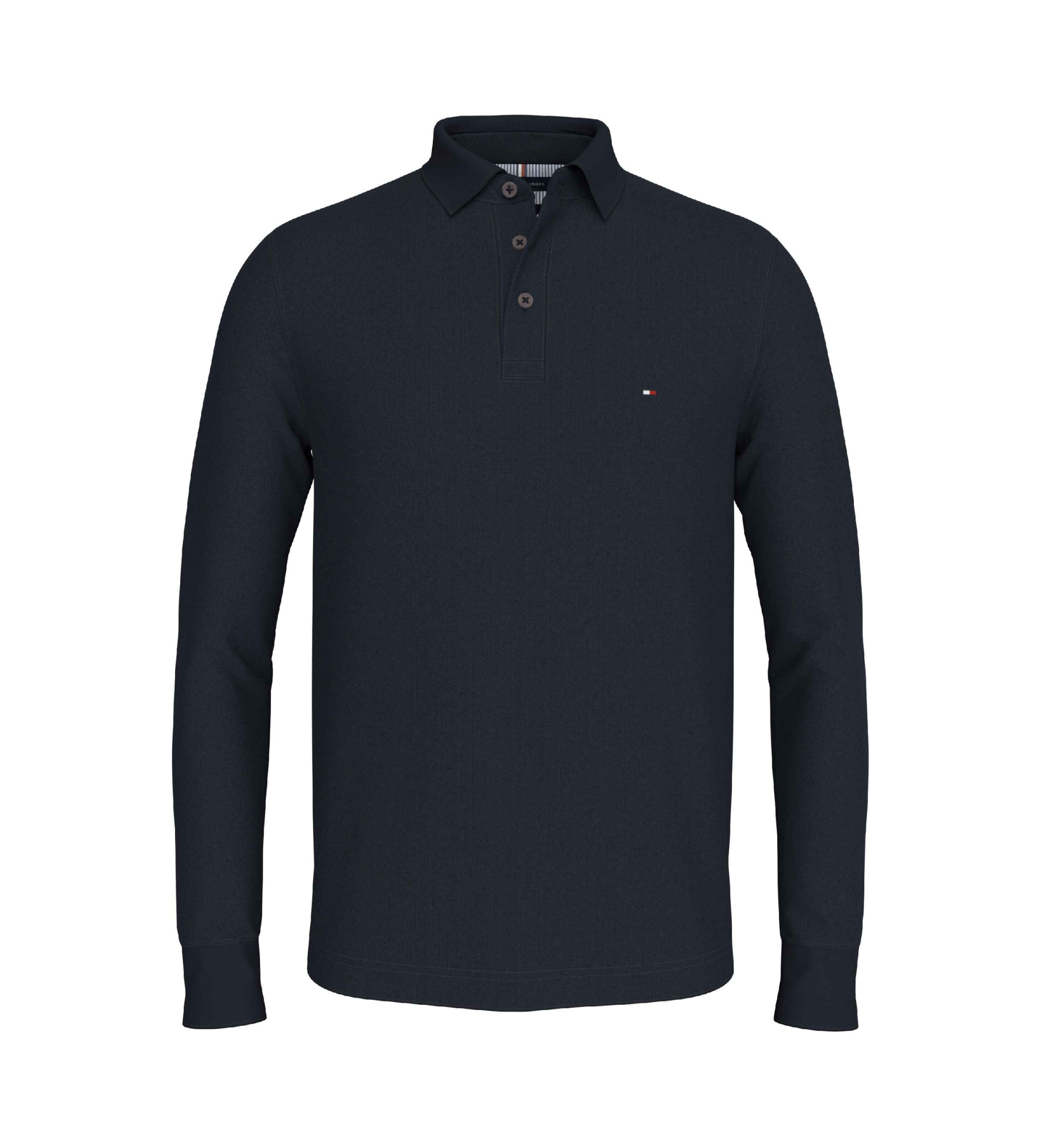 Ce polo à manches longues et à la coupe ajustée est conçu en coton biologique extensible et comporte un logo de marque complexe.