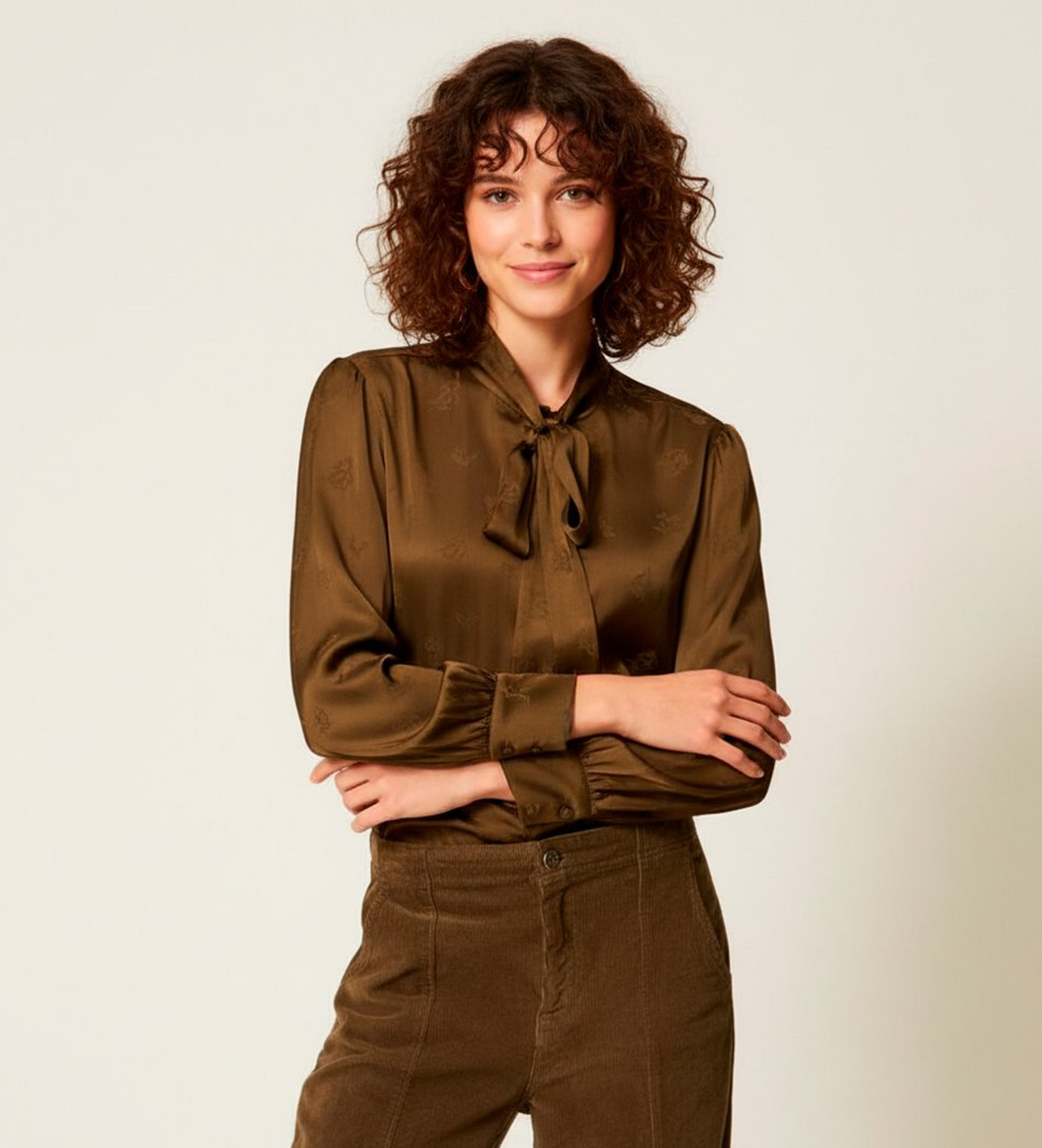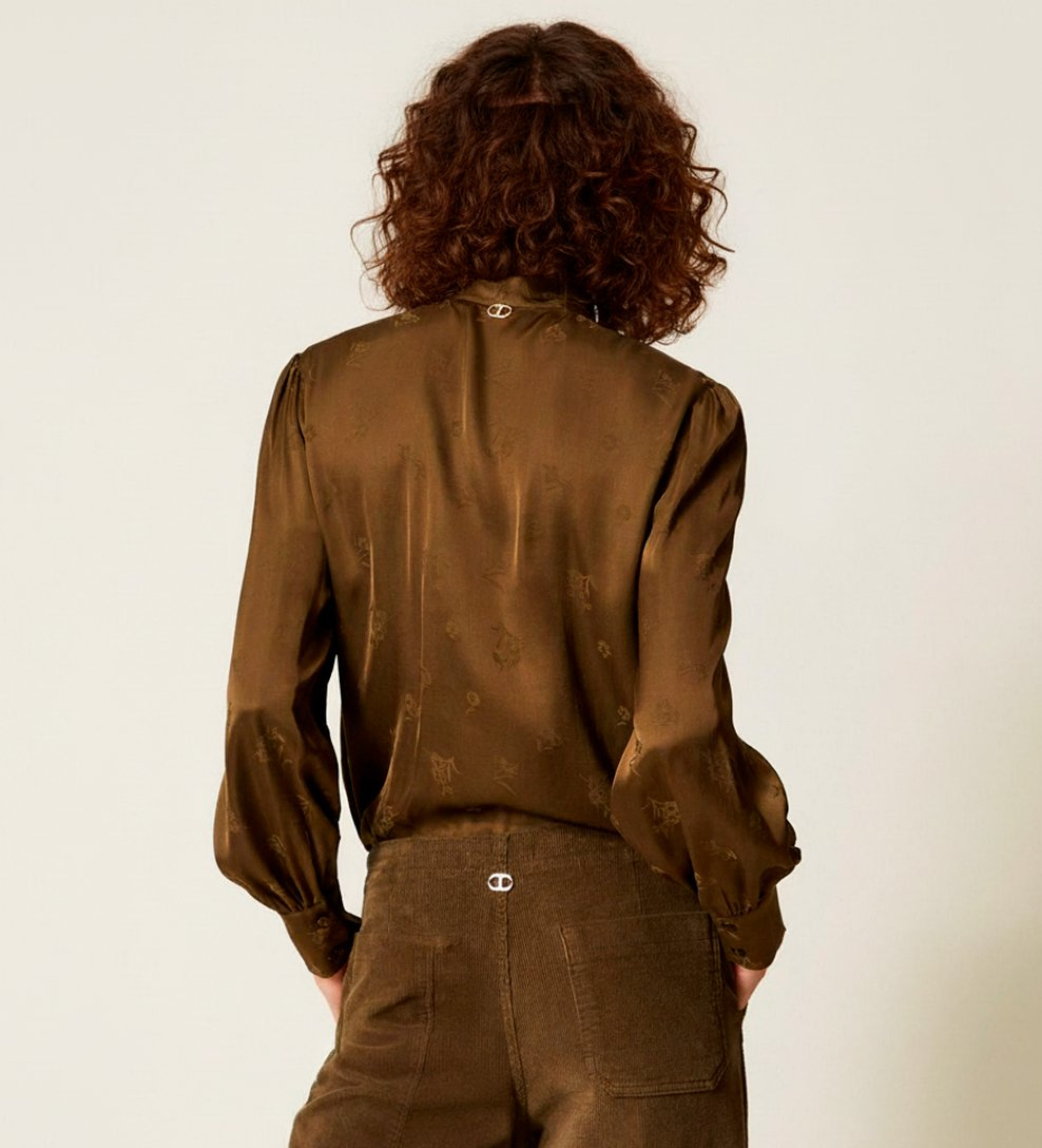 Chemise en jacquard de satin de viscose à motif floral. Elle présente un col avec liens en ruban, une fermeture à boutons, des manches longues avec poignets et boutons, et une coupe droite.