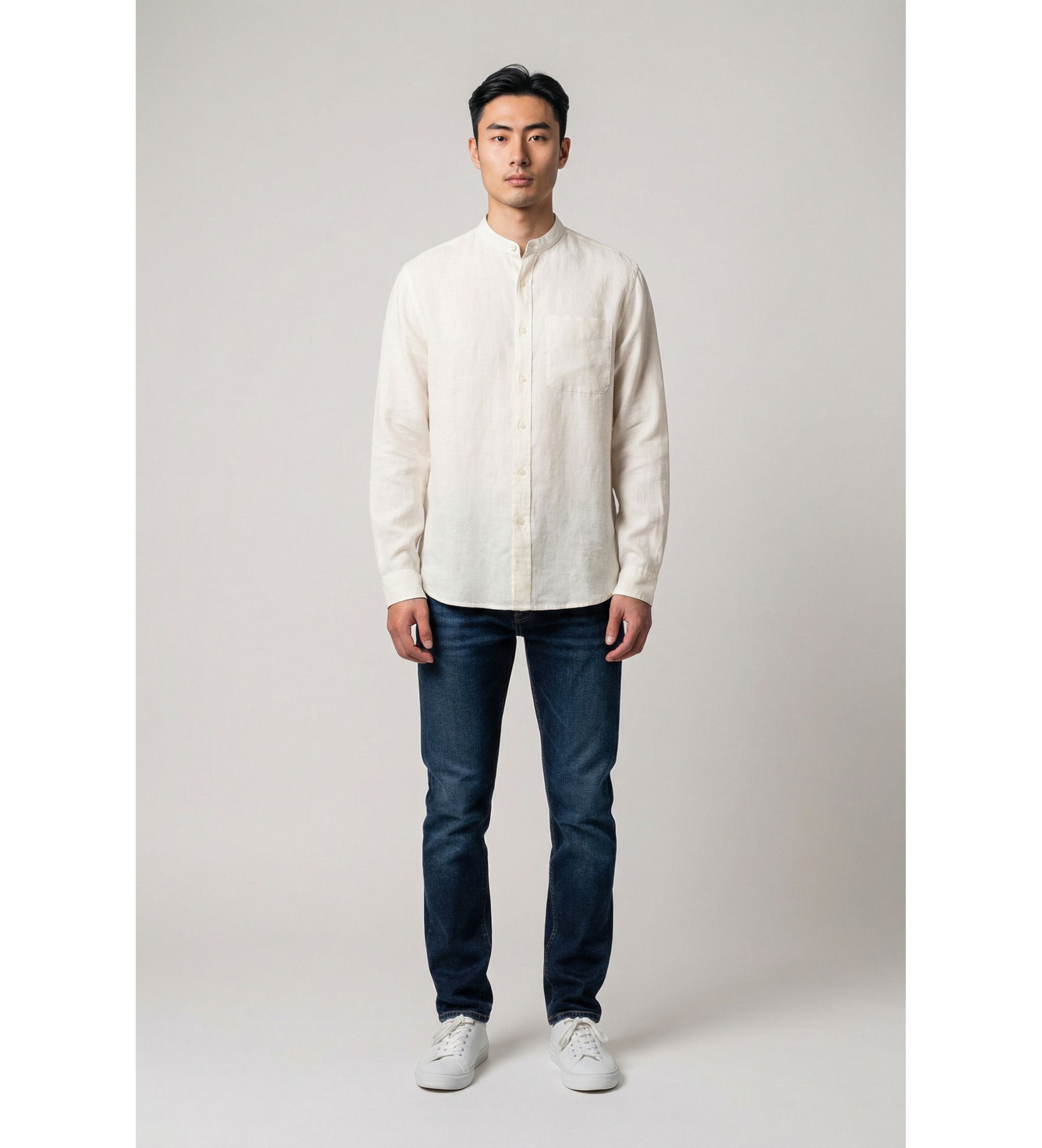 Une chemise en lin blanc cassé avec un col mao, un essentiel intemporel qui capture l'essence de l'été méditerranéen avec une élégance naturelle et sans effort. Son tissu en lin et sa coupe décontractée la rendent parfaite pour les journées chaudes en ville ou à la plage.