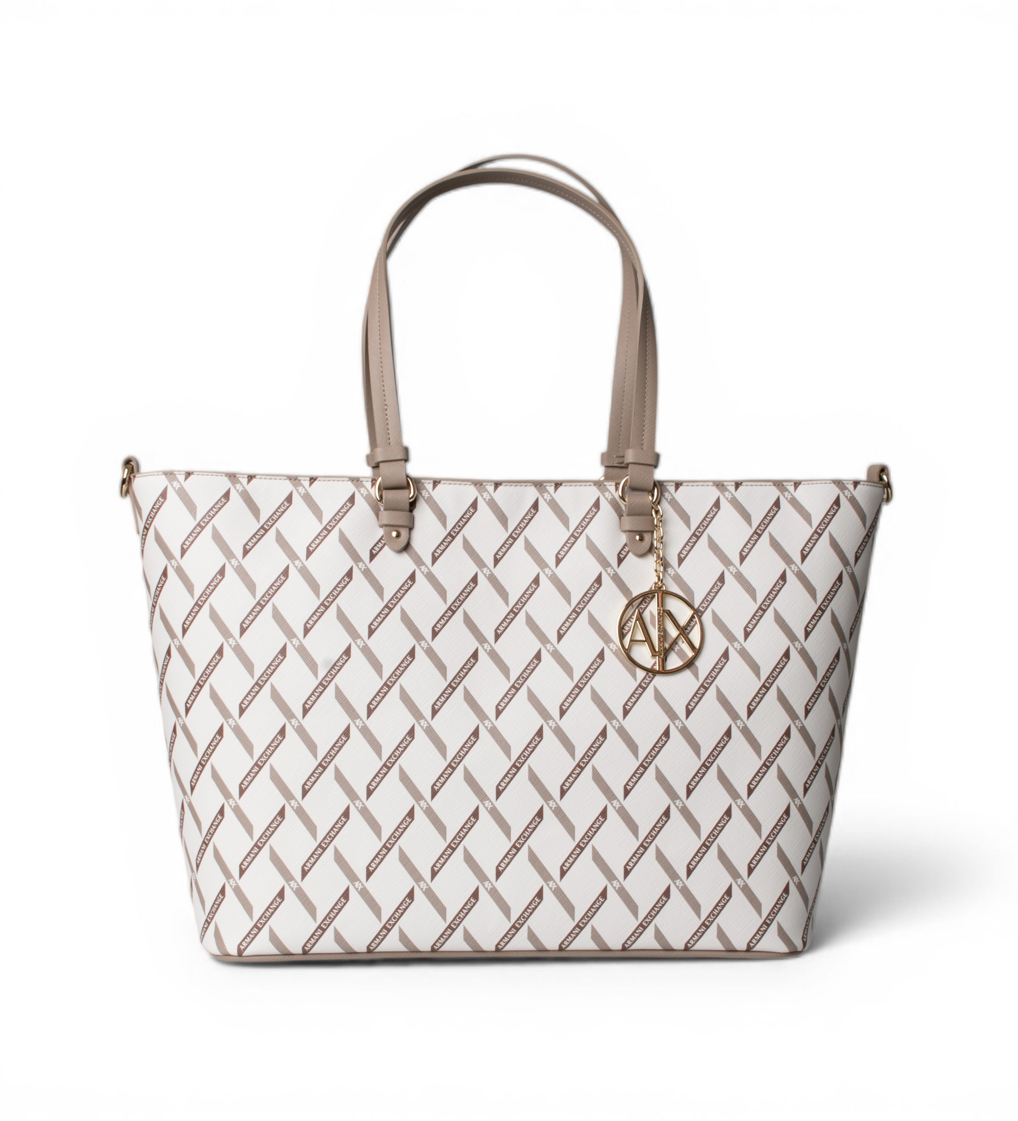 Il monogramma all-over come dichiarazione di stile. Questa shopper Armani Exchange porta l'identit del marchio a un livello superiore con una stampa all-over dell'iconico carattere AX che ricopre ogni centimetro della borsa. La silhouette spaziosa e strutturata in poliestere di alta qualit la rende la compagna perfetta per tutti i giorni, mentre il ciondolo dorato con il logo circolare e i manici dai toni neutri aggiungono quella finitura sofisticata che contraddistingue il marchio italiano.