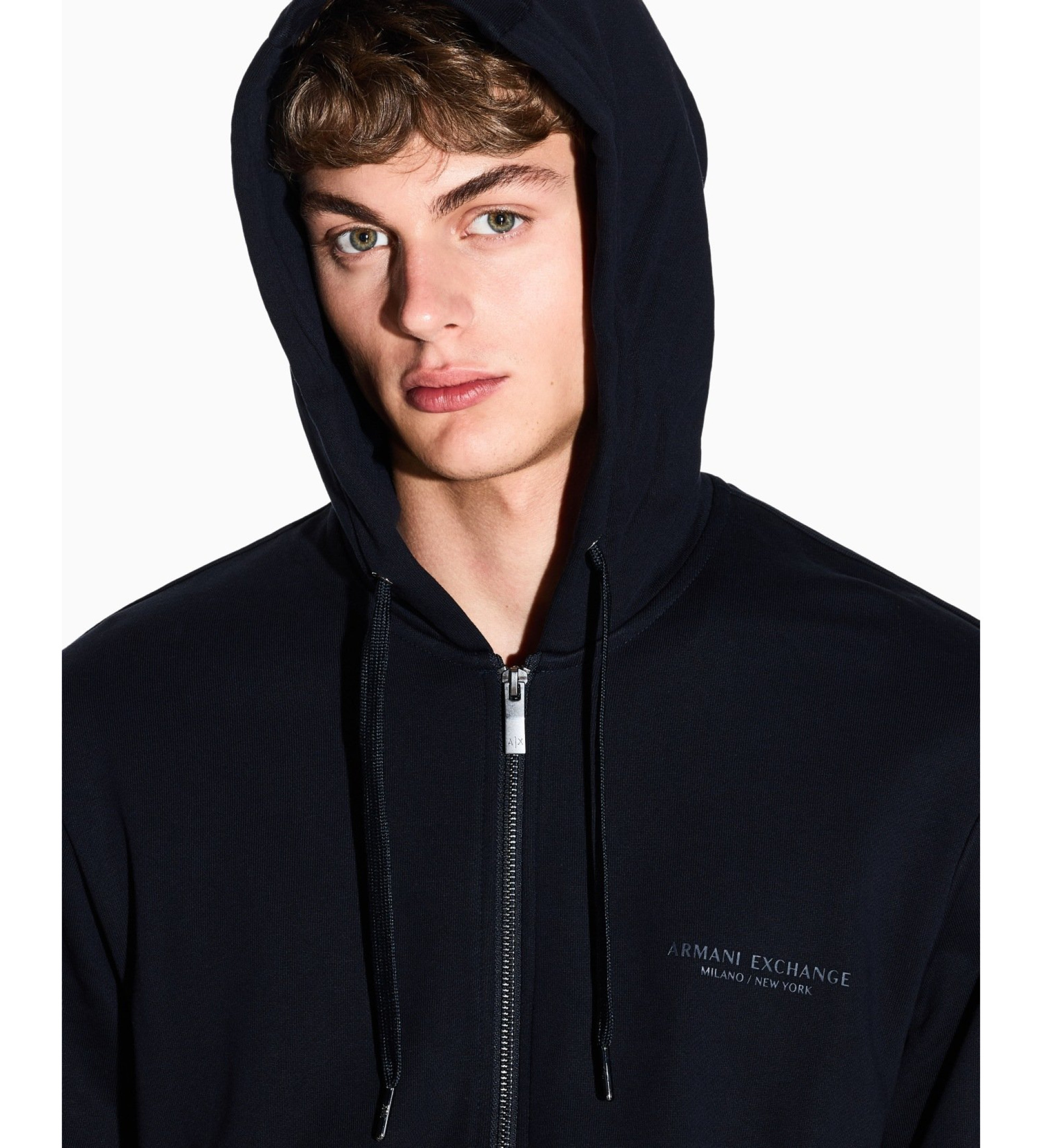 Una felpa con cappuccio in morbido cotone, un capo essenziale per il comfort quotidiano senza rinunciare allo stile. Questa felpa con cappuccio si distingue per il design pulito e funzionale, con cappuccio regolabile con coulisse, chiusura full-zip e pratiche tasche. La delicata stampa "Armani Exchange Milano / New York" tono su tono sul petto aggiunge un tocco di raffinatezza.