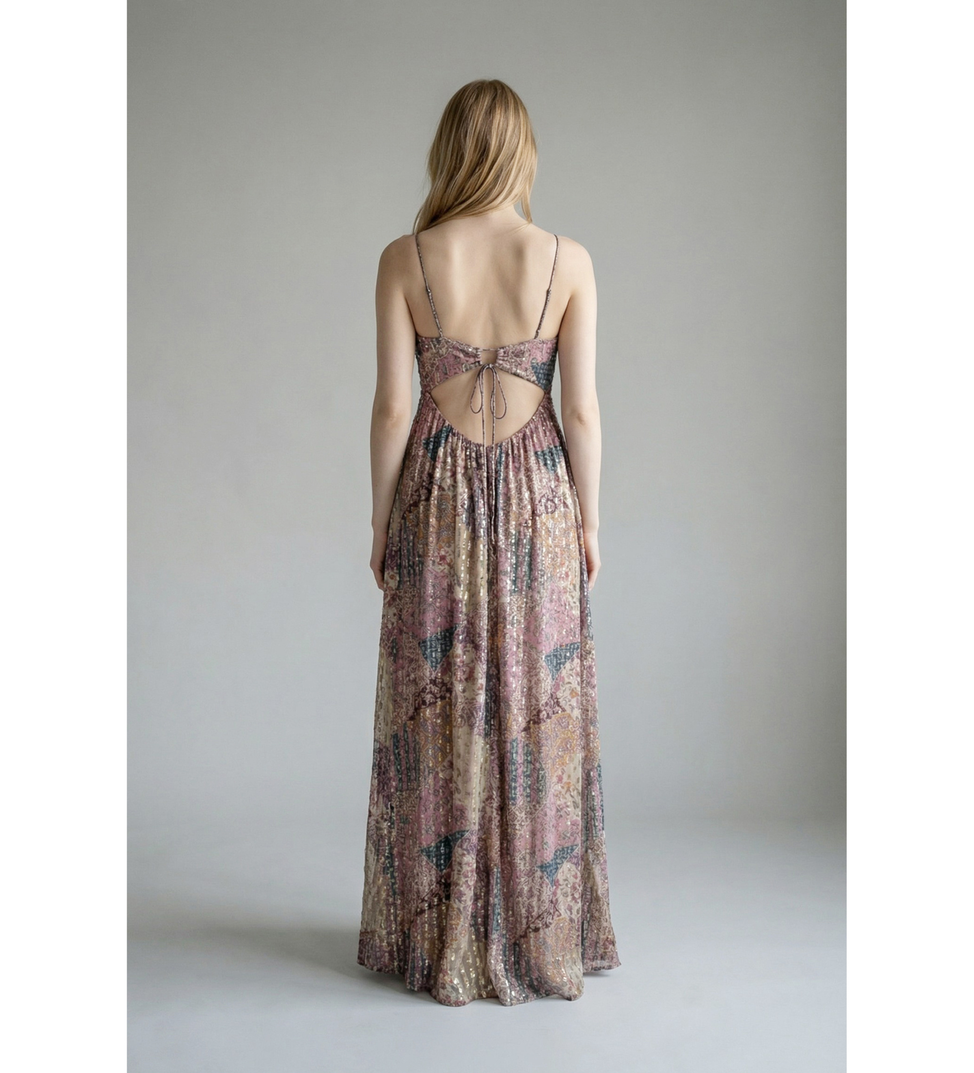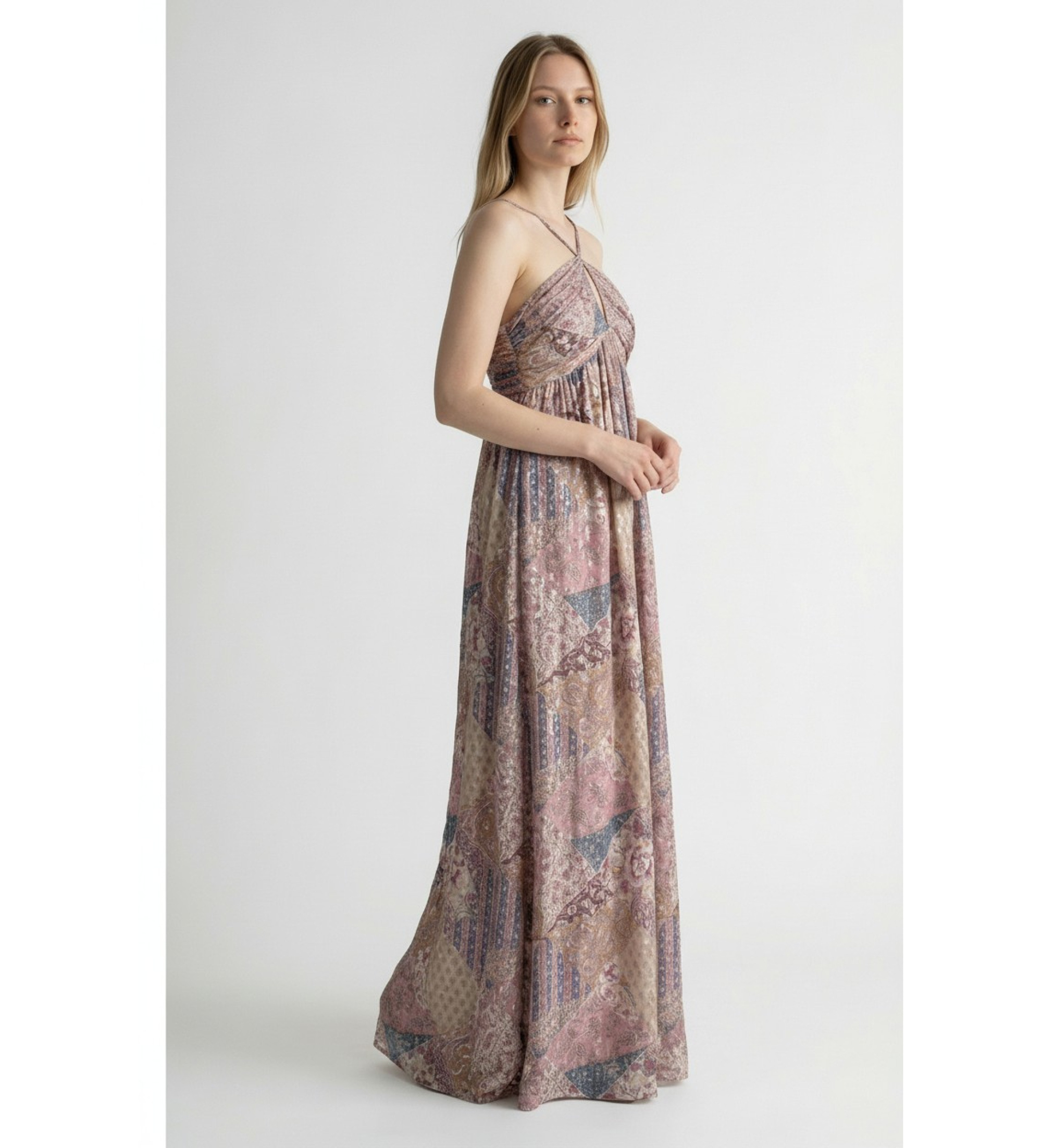 Un abito che cattura l'essenza di un'estate romantica. La stampa patchwork di ispirazione orientale, in una delicata palette di rosa, blu e toni della terra, trasforma questo capo in un'opera d'arte che si adatta a ogni movimento. Perfetto per serate speciali, matrimoni o fughe al mare.