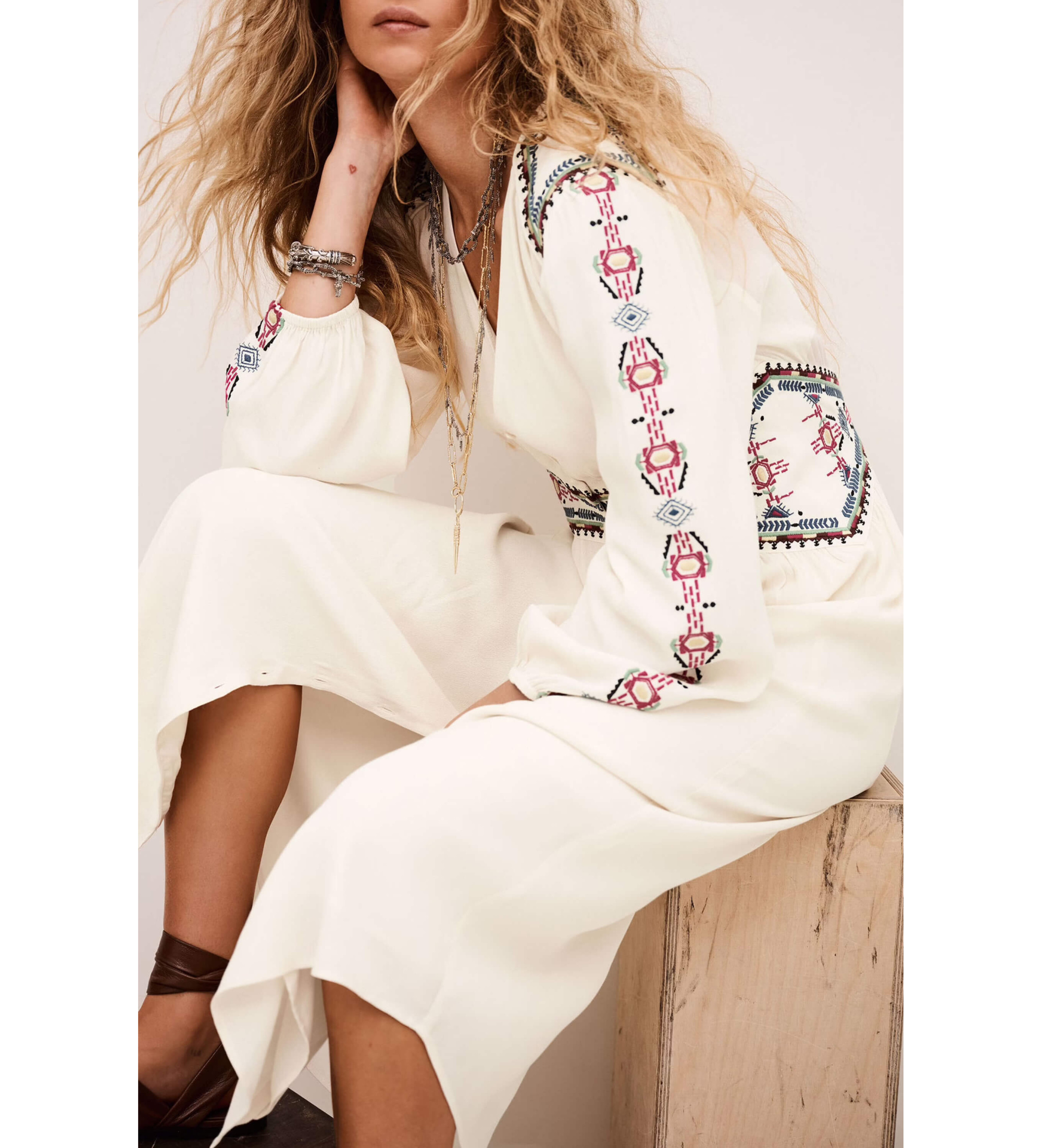 Scopri questo abito midi bohémien color crema con ricami etnici multicolori, un modello che unisce un'eleganza romantica a dettagli artigianali unici. Lo scollo a V con abbottonatura frontale, le lunghe maniche a sbuffo con polsini elastici e la vita definita con un pannello arricciato creano una silhouette lusinghiera e femminile. I ricami geometrici nei toni del rosa, blu e nero su spalle, maniche e vita aggiungono un carattere distintivo ispirato ai motivi tradizionali, rendendo questo abito il capo perfetto per le occasioni speciali dallo spirito bohémien.