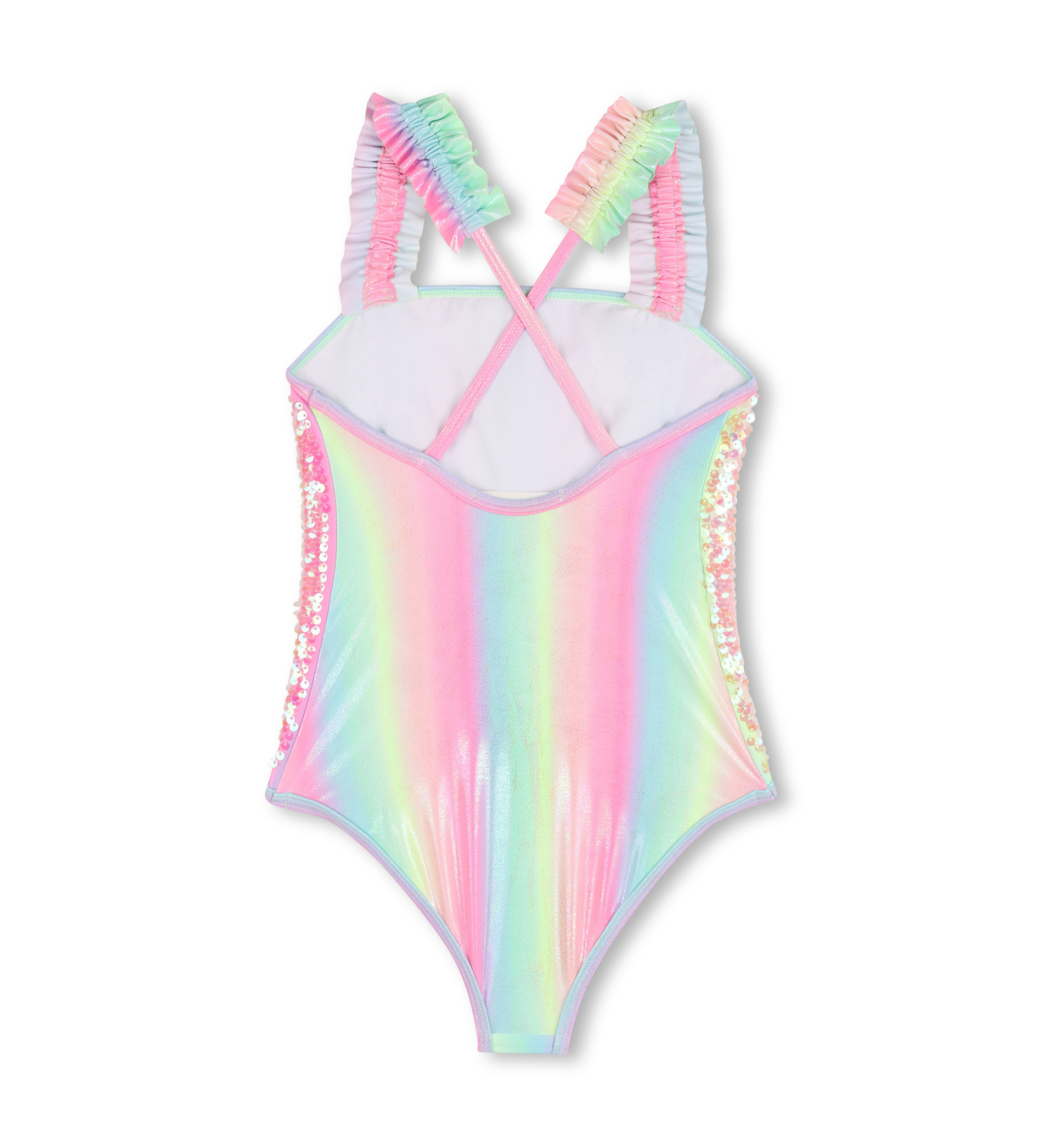 Costume intero in poliestere con spalline arricciate e paillettes trasparenti sul davanti. Un costume scintillante ed elegante che unisce il comfort di un design funzionale a dettagli festosi e accattivanti per farti risaltare in spiaggia o in piscina.
