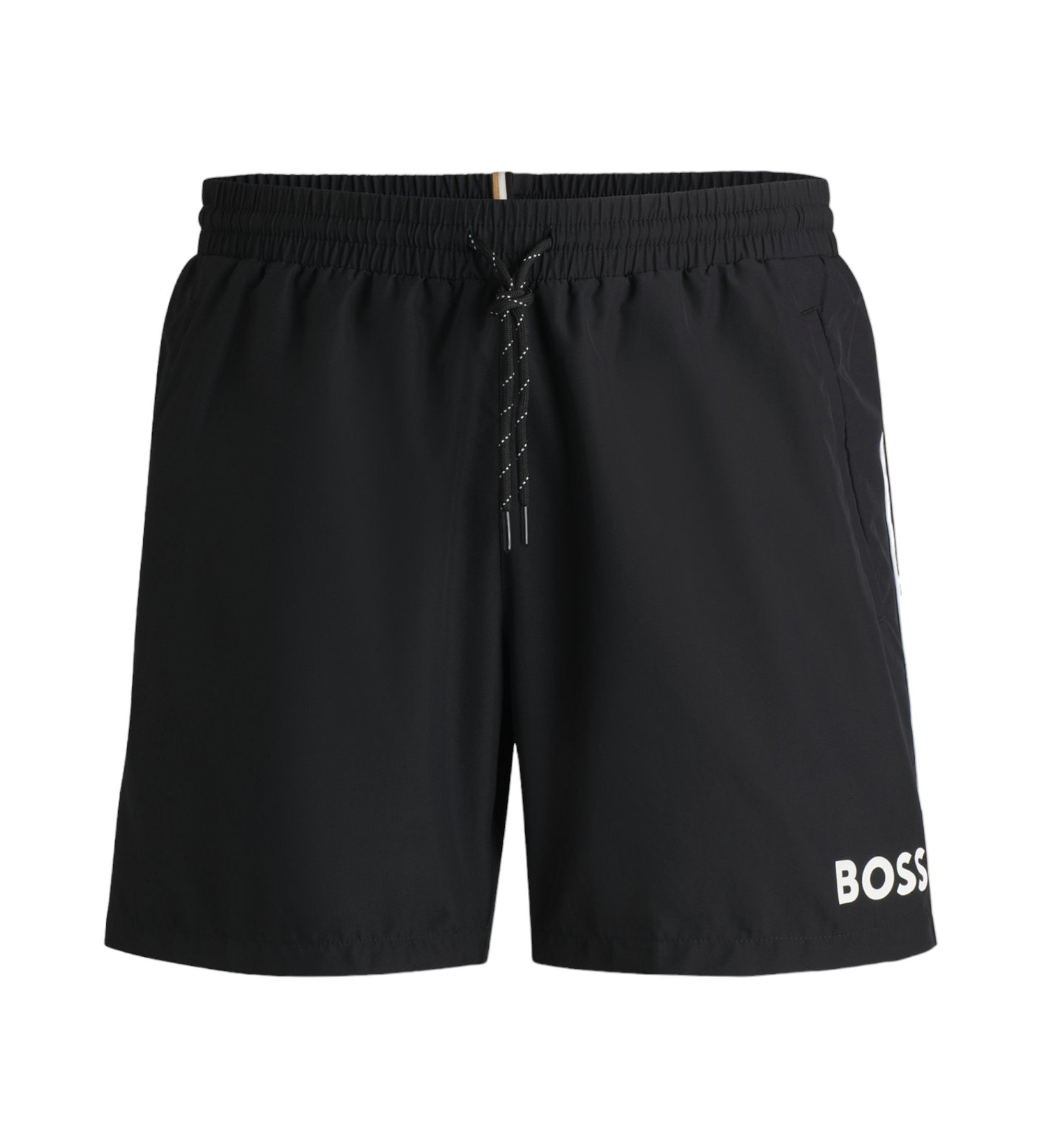 Un moderno pantaloncino da bagno BOSS, realizzato in tessuto ad asciugatura rapida con fodera integrale, stampa del logo e finiture a contrasto.