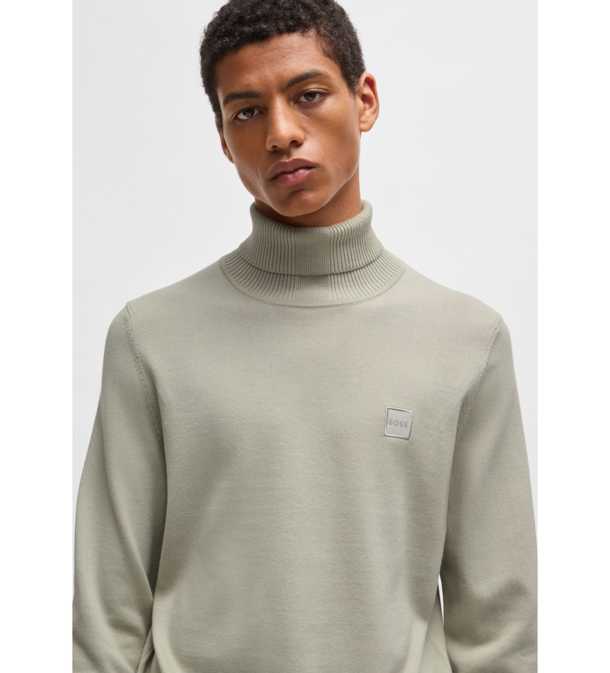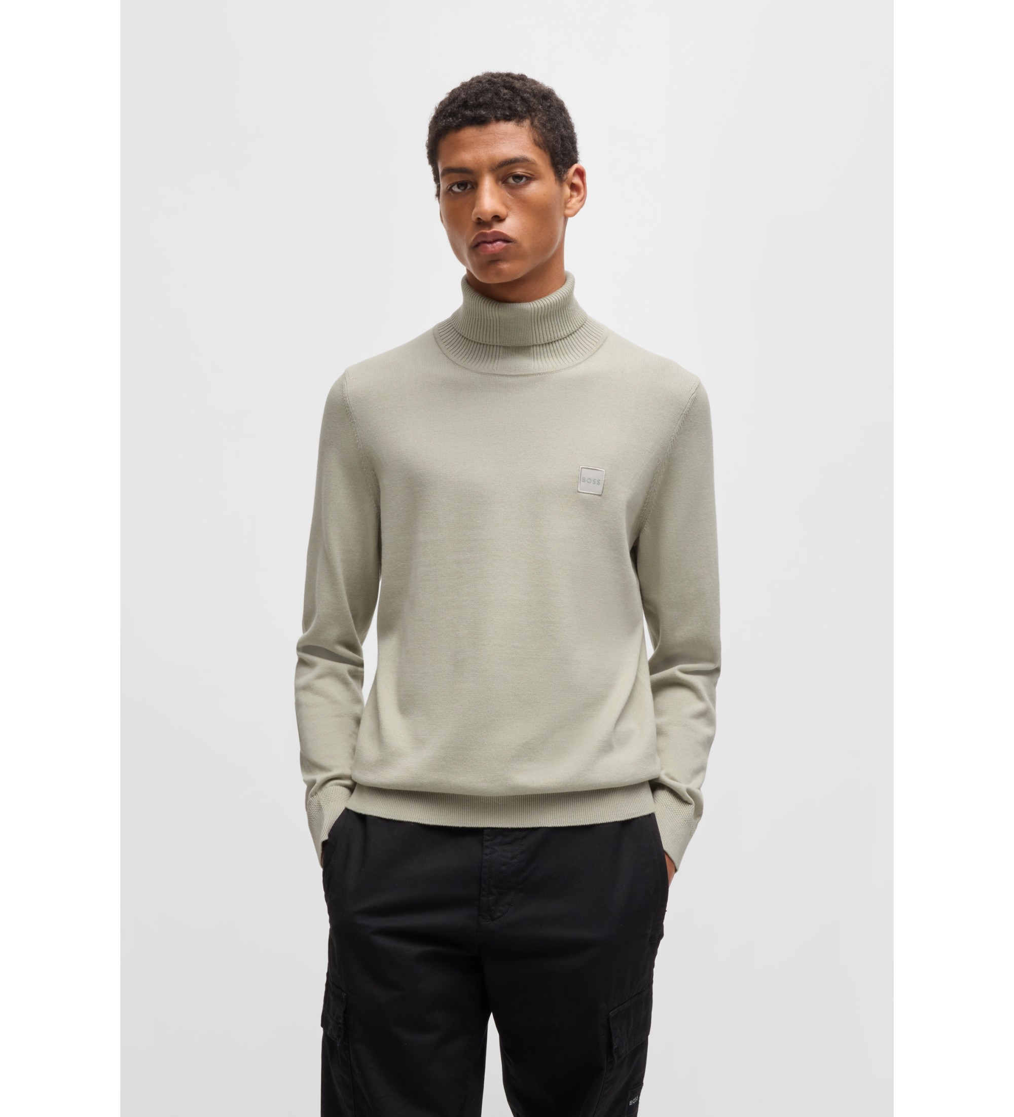 Scegli il comfort con il maglione dolcevita da uomo BOSS, realizzato in maglia di cotone e cashmere. Una toppa con logo sul petto completa il look.
