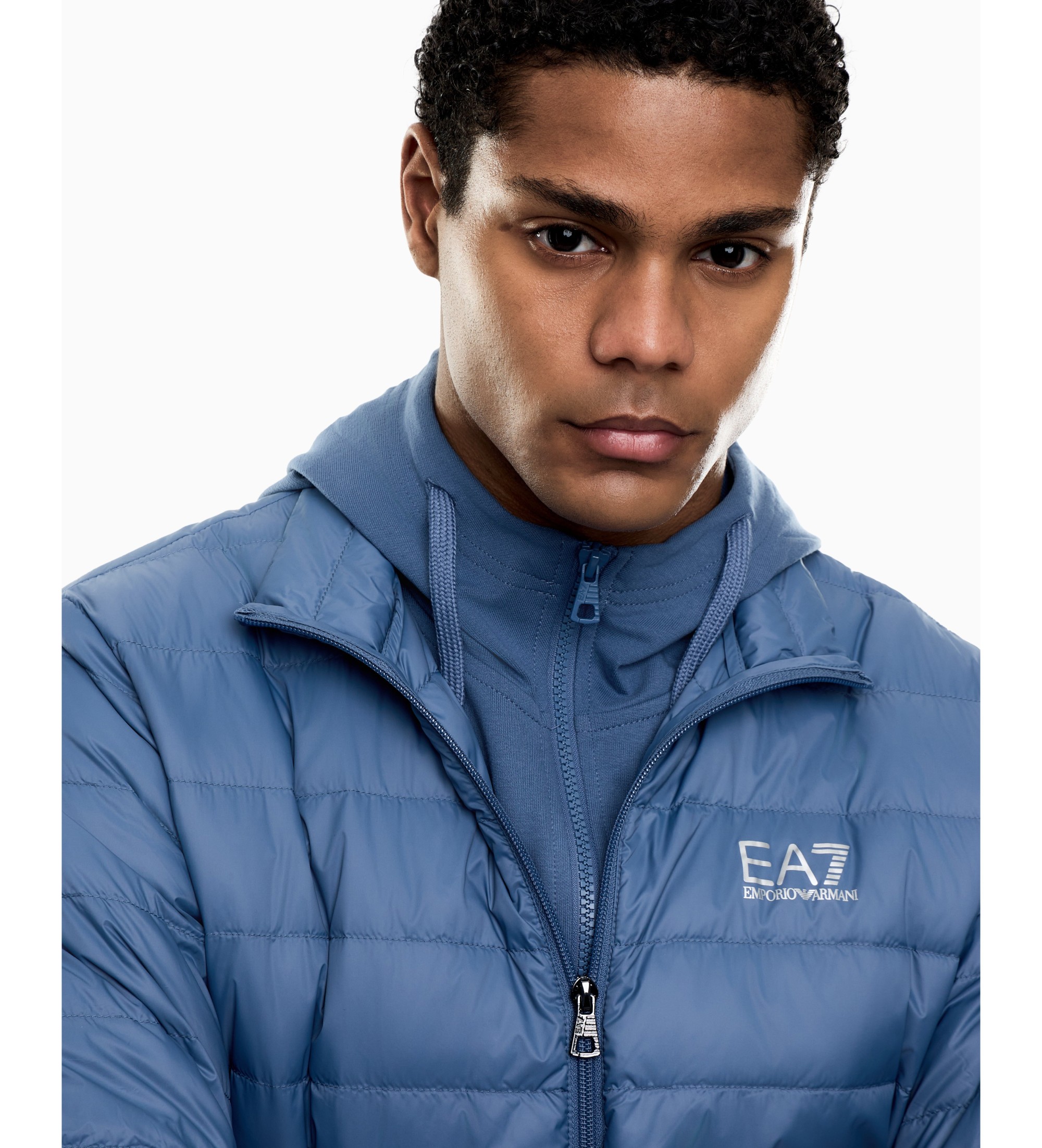 Composizione: 55% poliammide riciclata, 45% poliammide. Tessuto: 100% poliammide. Bordo elastico: 77% poliammide, 23% elastan. Imbottitura: 90% piumino d'anatra bianca, 10% piume d'anatra bianca. Fodera: 100% poliammide.