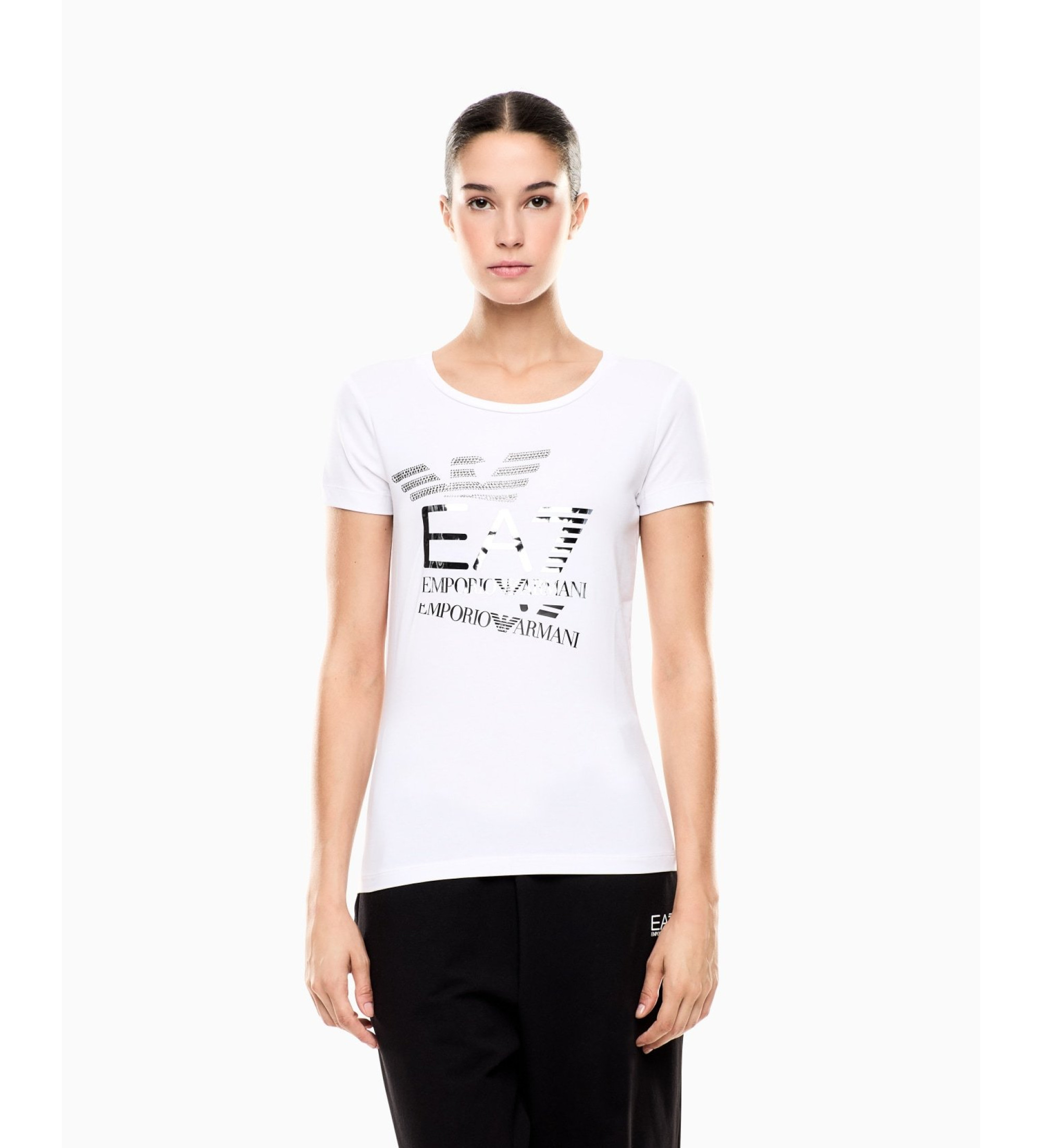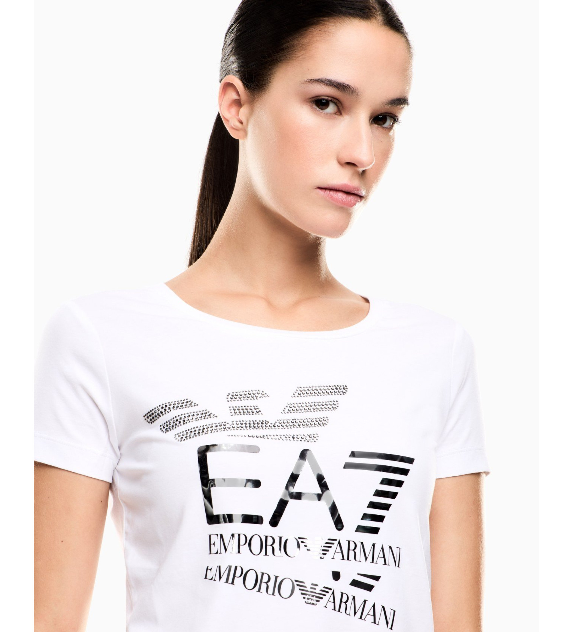 Una t-shirt girocollo a maniche corte dal design pulito e minimalista, realizzata in cotone elasticizzato. La parte anteriore presenta una stampa logo a contrasto, che include un'aquila in strass e un logo EA7 metallico. Il logo EA7 è il protagonista della collezione Logo Series, che questa stagione offre una versatile gamma di interpretazioni, alternando stampe tono su tono, motivi retrò e formati mini. Comodi e versatili, questi capi sono perfetti per il tempo libero e il relax.